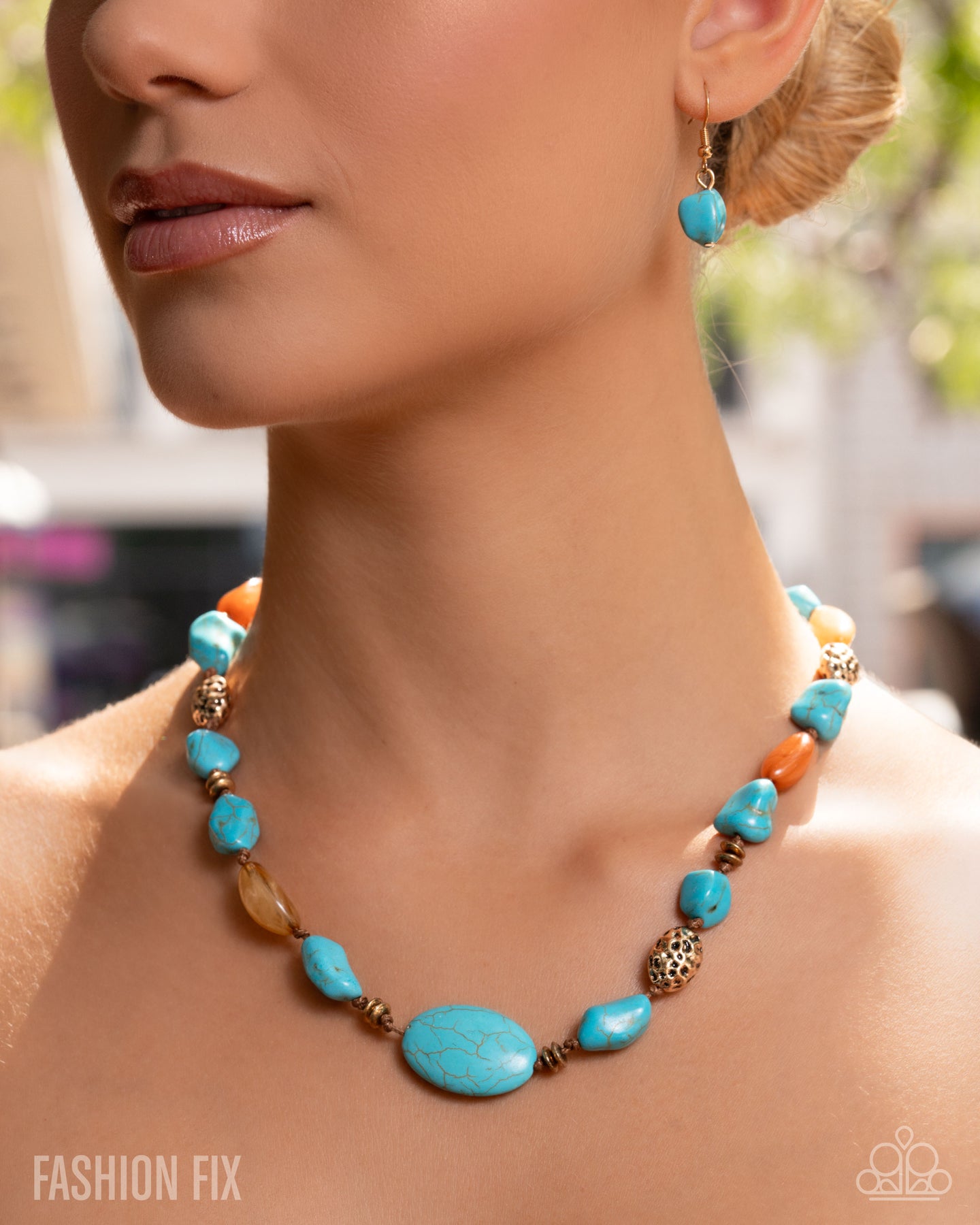 Infused along a brown cord, a collection of varying sizes of chiseled turquoise stones, hammered antiqued gold pebbles, swirled brown acrylics, and antiqued gold discs and accents patterns around the neckline for an artisan-inspired display. Features an adjustable clasp closure. As the stone elements in this piece are natural, some color variation is normal.