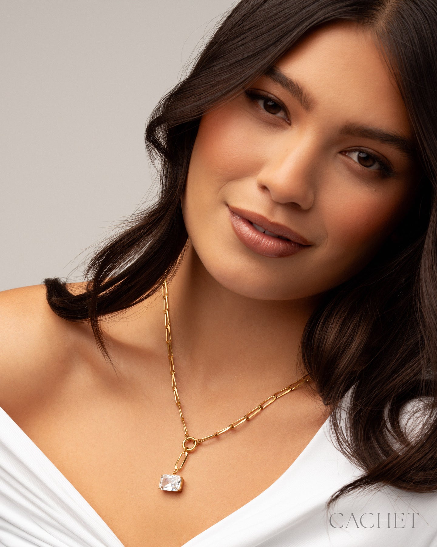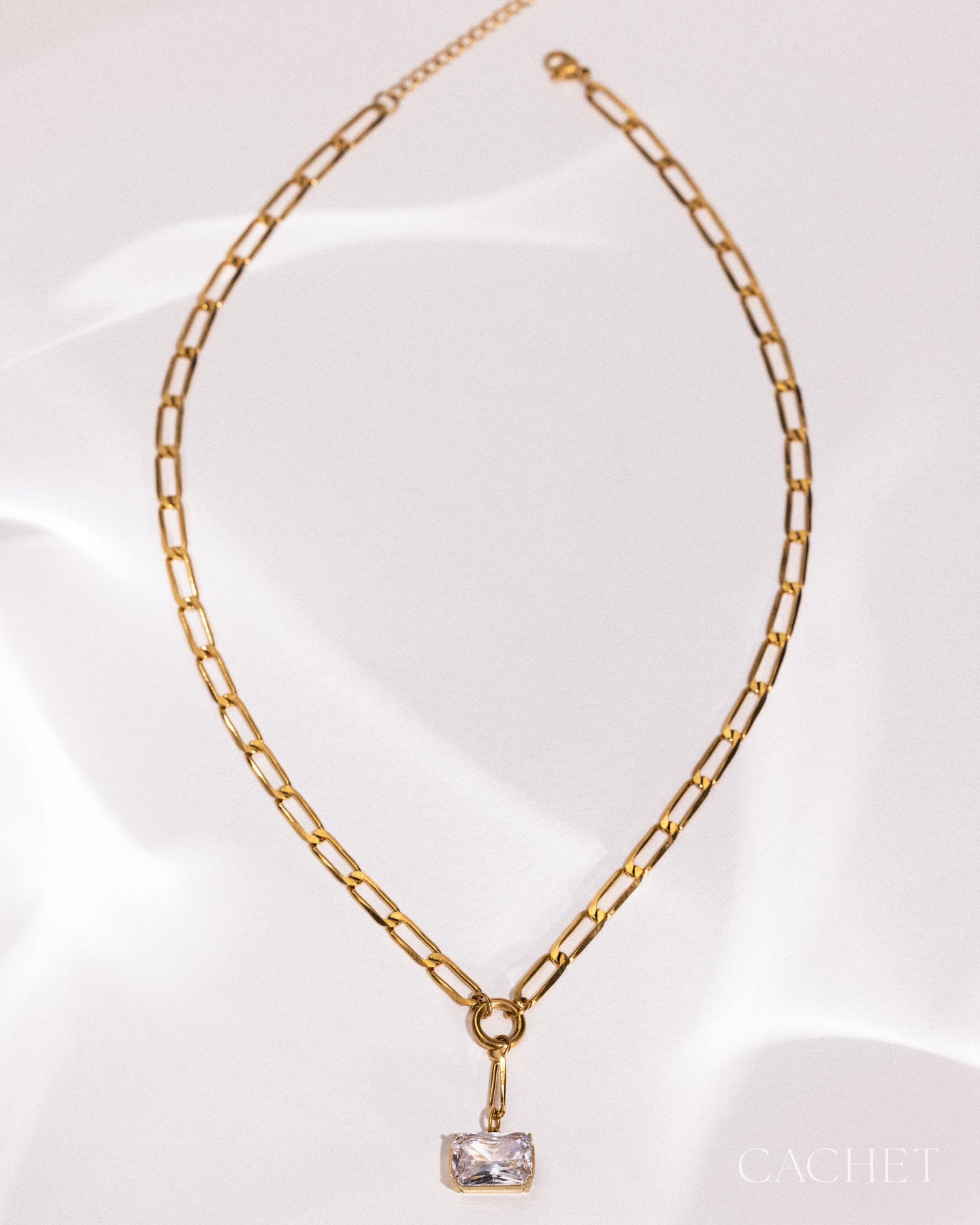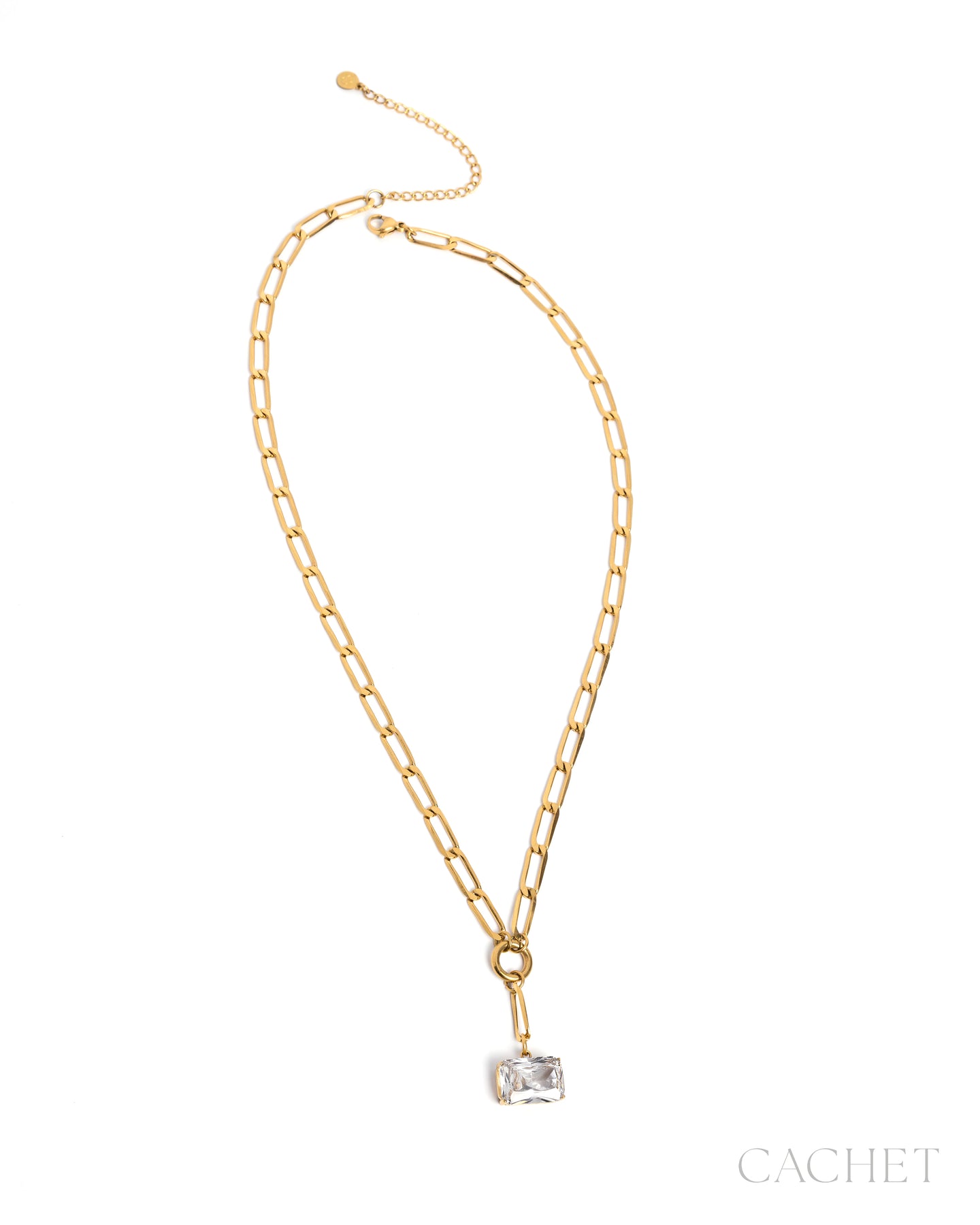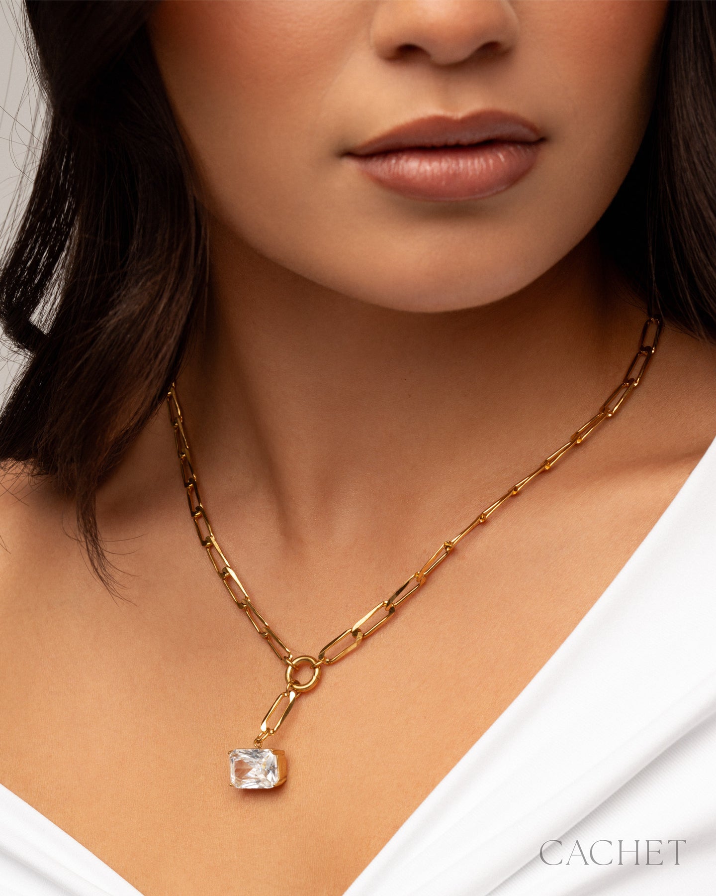 Like modern clarity, the necklace “Crysta” highlights emerald-cut cubic zirconia simplicity with clean lines and luminous paperclip chains.