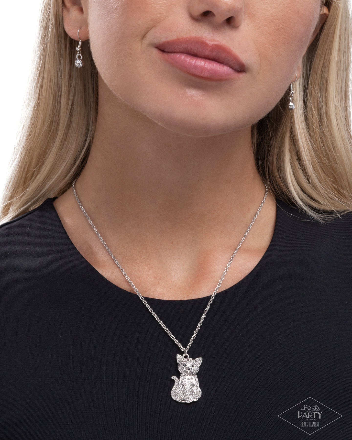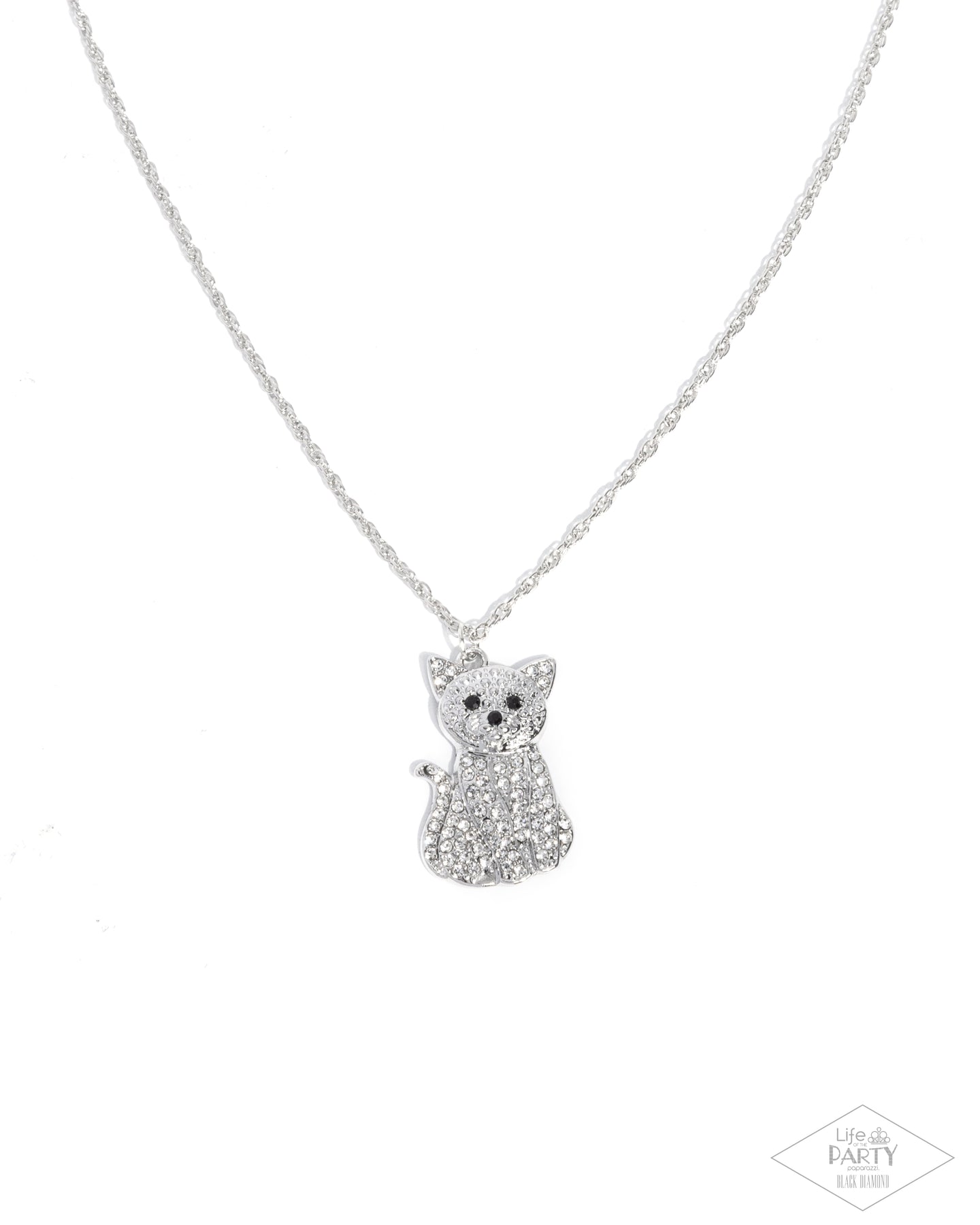 A delicate silver chain showcases a dazzling cat pendant. Encrusted with glittering rhinestones, the cat charm is given a whimsical yet sophisticated look. Its black rhinestone eyes and nose add an adorable contrast to the design, making it a charming accessory for any cat lover. Features an adjustable clasp closure.