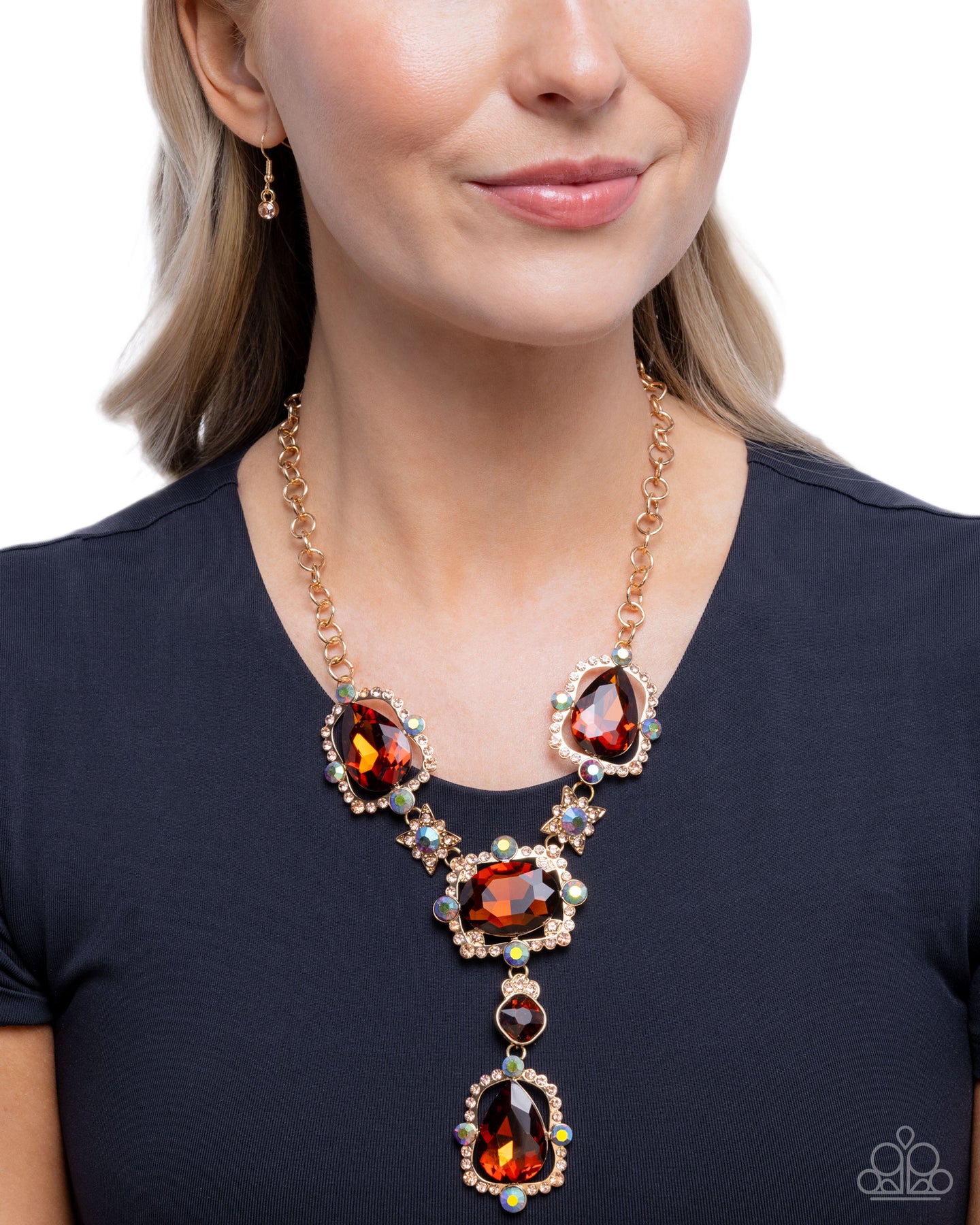 Pronged in airy Golden Shadow rhinestone and blue iridescent gem gold frames, a collection of tea gems in varying cuts alternates with blue iridescent gem-centered, Golden Shadow rhinestone stars, extending below the chest from a gold ring chain for a fabulous, fancy pop of color. Features an adjustable clasp closure. Due to its prismatic palette, color may vary.