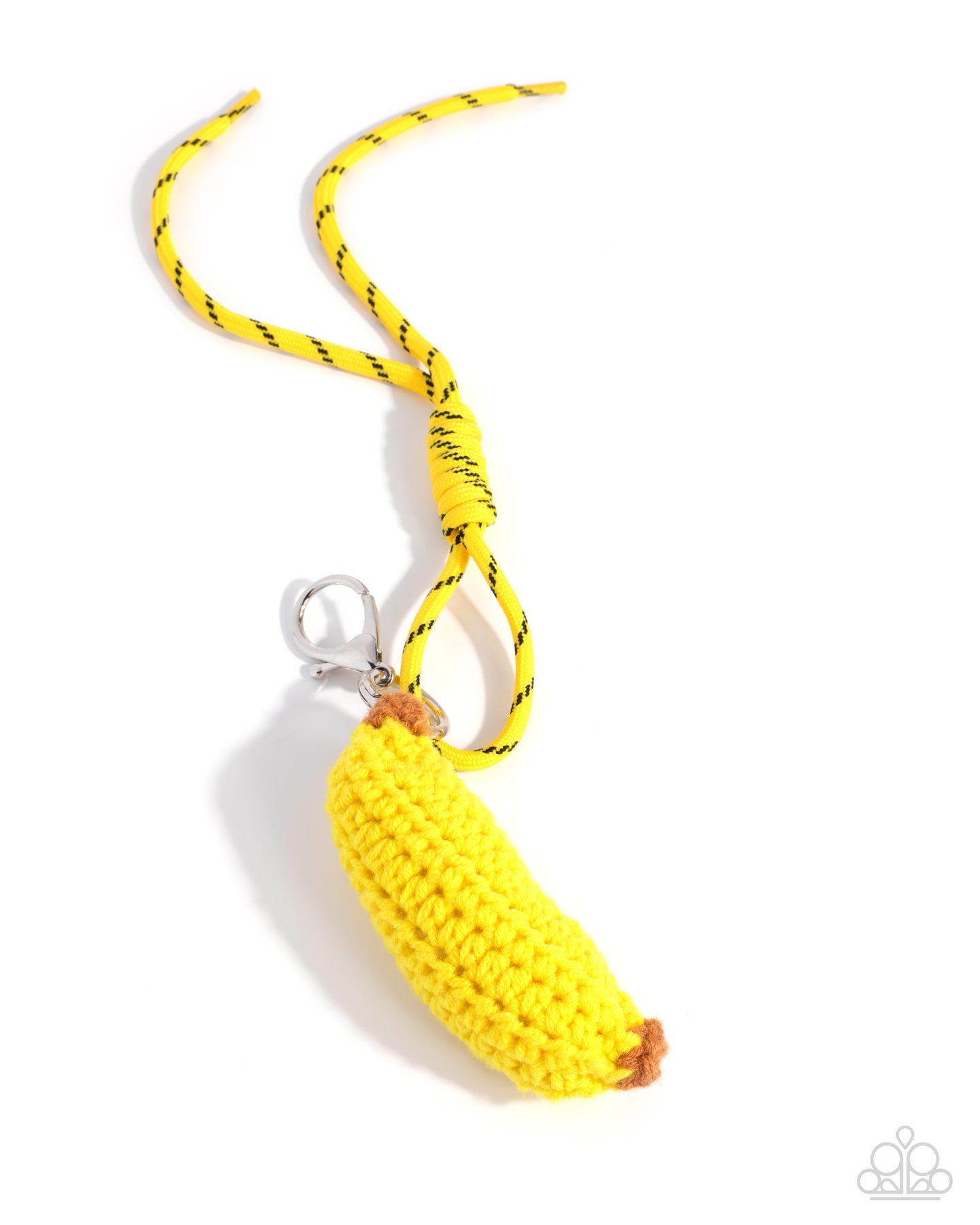 Threaded along a vibrant yellow and black-patterned cord, a vibrant crochet banana charm stands out. Features a clasp closure. Can be attached to a variety of bags for a simple, seasonal look.