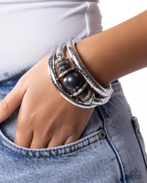 Threaded along a wire that coils around the wrist, copious silver discs in sleek, textured, studded, and thick motifs join three black stones in varying sizes, creating a colorfully chic infinity wrap style bracelet. As the stone elements in this piece are natural, some color variation is normal.