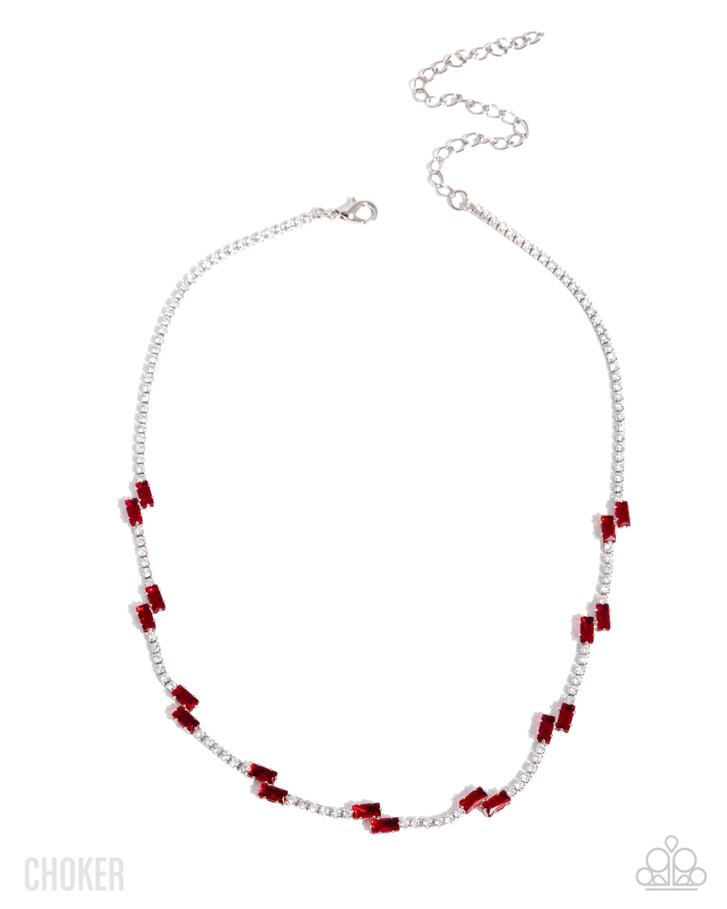 Pressed in silver square fittings, a dainty white rhinestone chain coalesces around the collar, sporadically interrupted by silver-pronged Poppy Red emerald-cut gems that lay slightly off-center for an adorably asymmetrical display. Features an adjustable clasp closure.