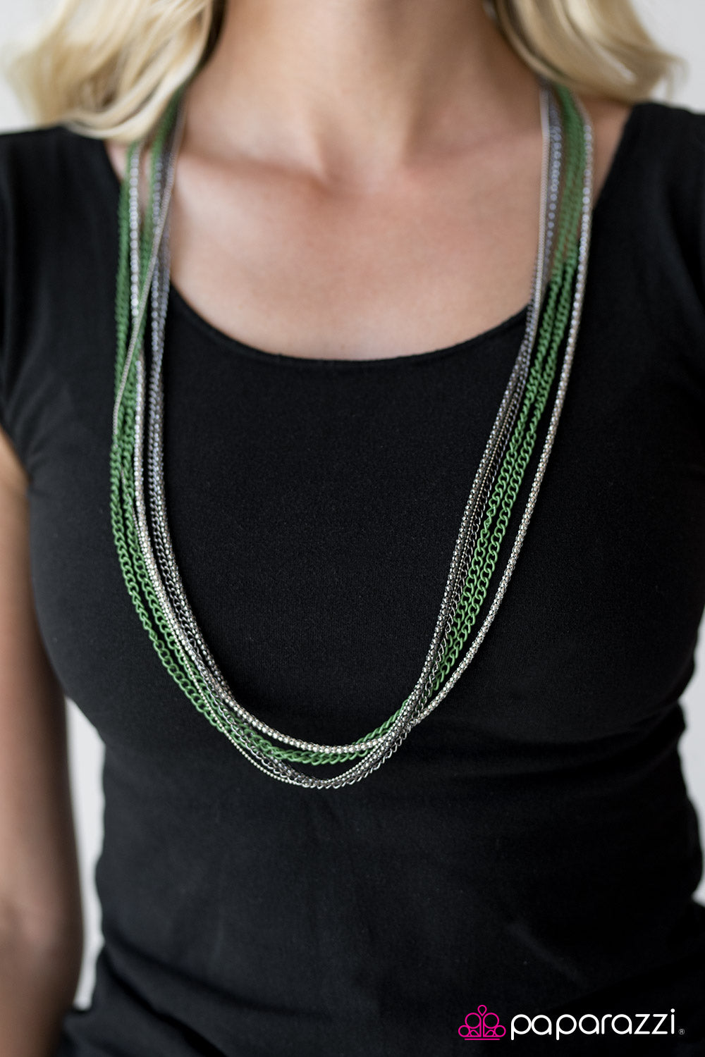 Brushed in a metallic finish, green chains collide with mismatched gunmetal and silver chains across the chest. Shimmery silver and gunmetal popcorn chains join the colorful layers, adding shimmery metallic texture to the spunky mixed palette. Features an adjustable clasp closure. Paparazzi Accessories