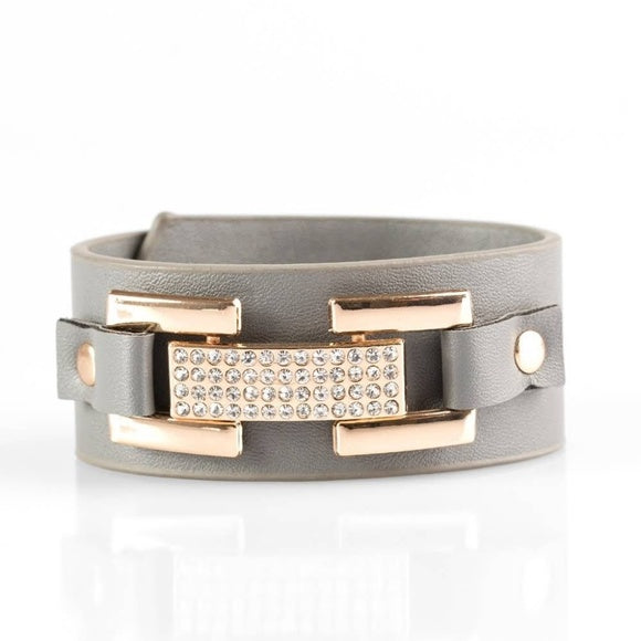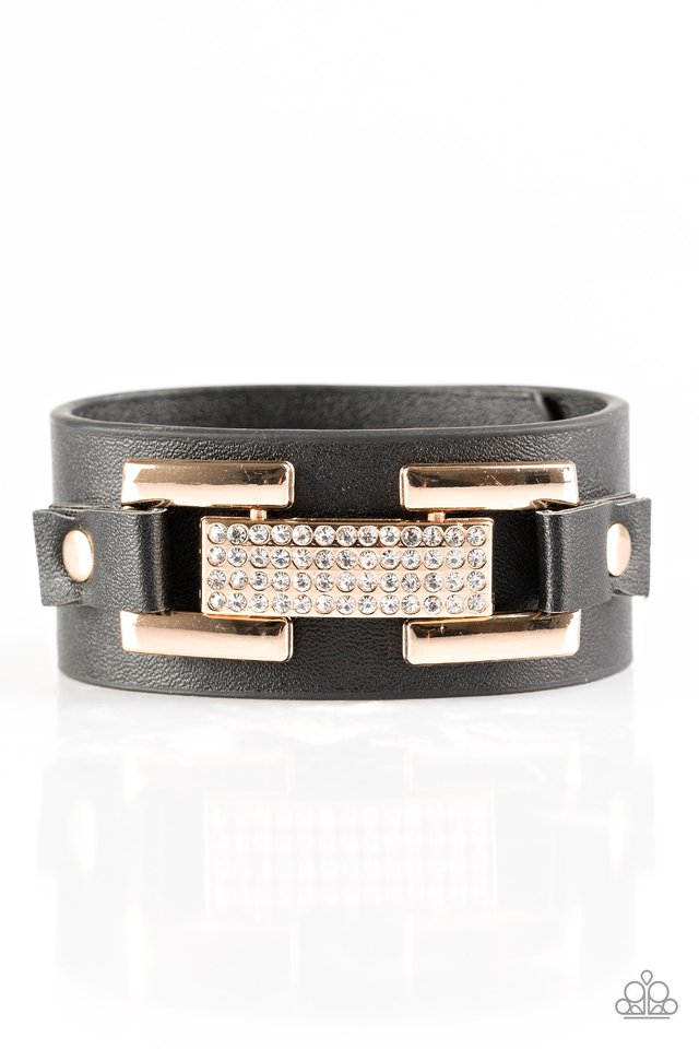 Encrusted in glittery white rhinestones, a glistening gold frame is studded in place across the front of a leather band for a glamorous look. Features an adjustable snap closure.