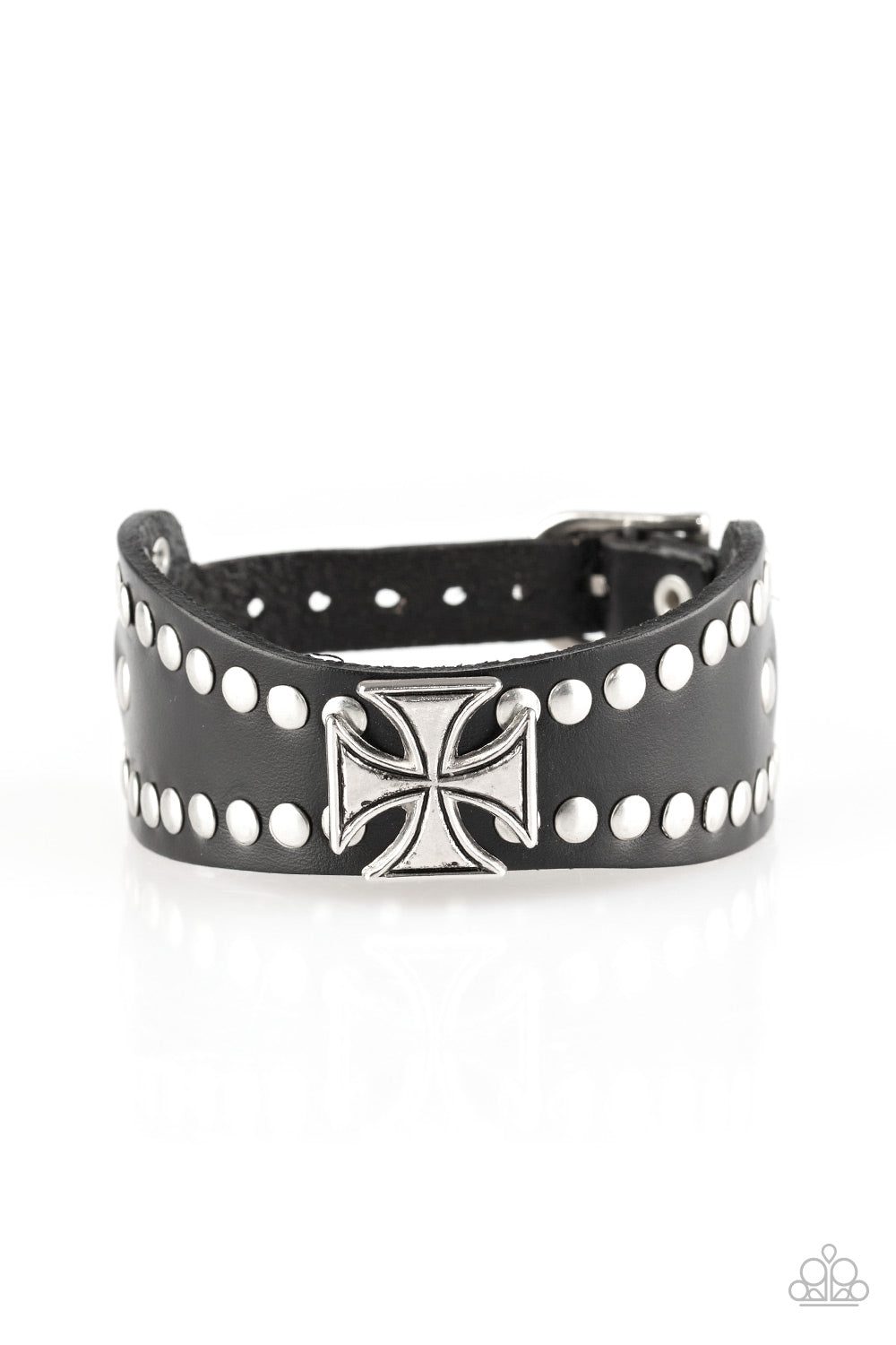 A bold metallic accent and silver studs are encrusted along a thick black leather band for a rugged look. Features an adjustable buckle closure.