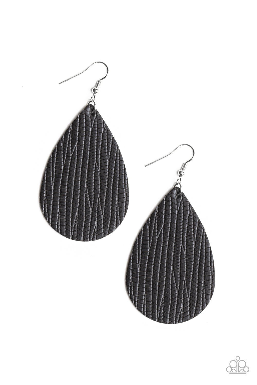 Stamped in an animal print inspired pattern, an earthy black leather teardrop swings from the ear for a trendy vibe. Earring attaches to a standard fishhook fitting.