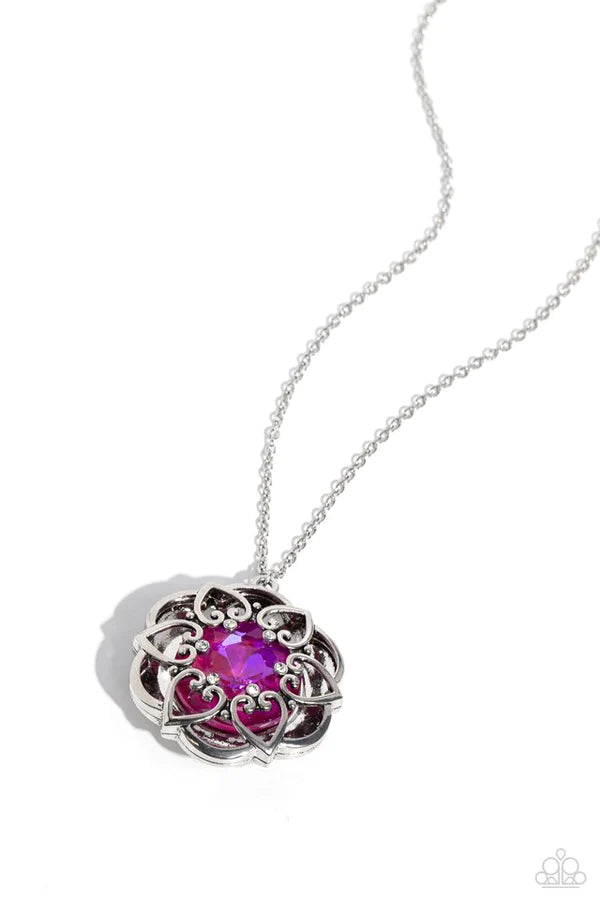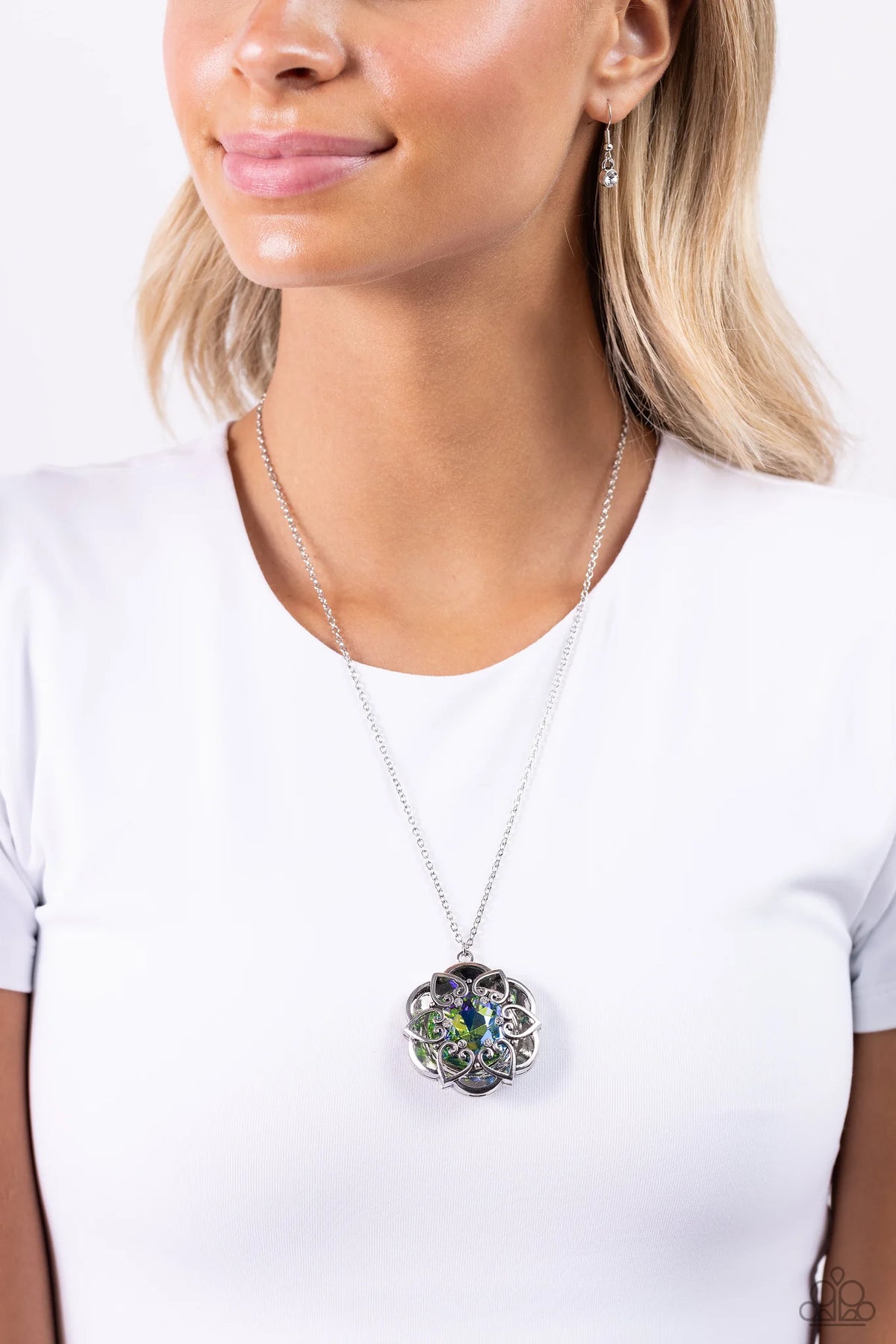 Pressed in the center of an oversized, thick silver floral frame, a green UV gem glimmers from the chest. Intricate silver hearts, sprinkled with dainty white rhinestones, encircles the inner circle of the floral frame to create ornate, 3D petals. The whimsical pendant swings from the bottom of a lengthened, dainty silver chain for a seasonal look. Features an adjustable clasp closure.