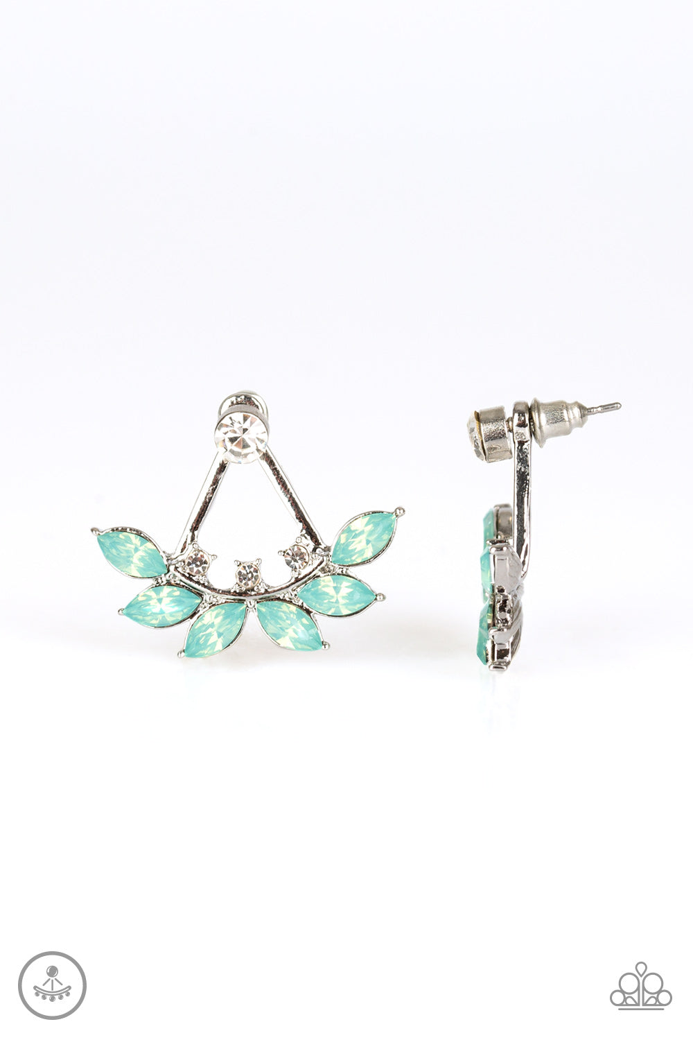 A solitaire white rhinestone attaches to a double-sided post, designed to fasten behind the ear. Encrusted in dainty white rhinestones and leafy green rhinestones, the angular double-sided post peeks out beneath the ear, creating a glittery foliage. Earring attaches to a standard post fitting.