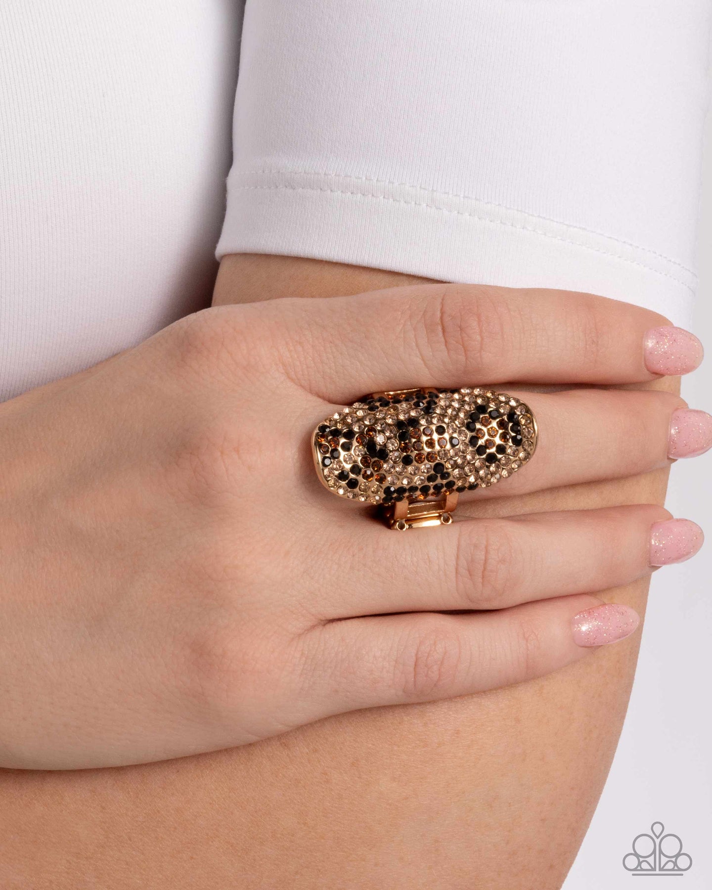 Embossed in tea, peach, and black rhinestones, a thick patterned gold oval frame folds around the finger atop airy gold bands for a trendy touchstone look. Features a stretchy band for a flexible fit.