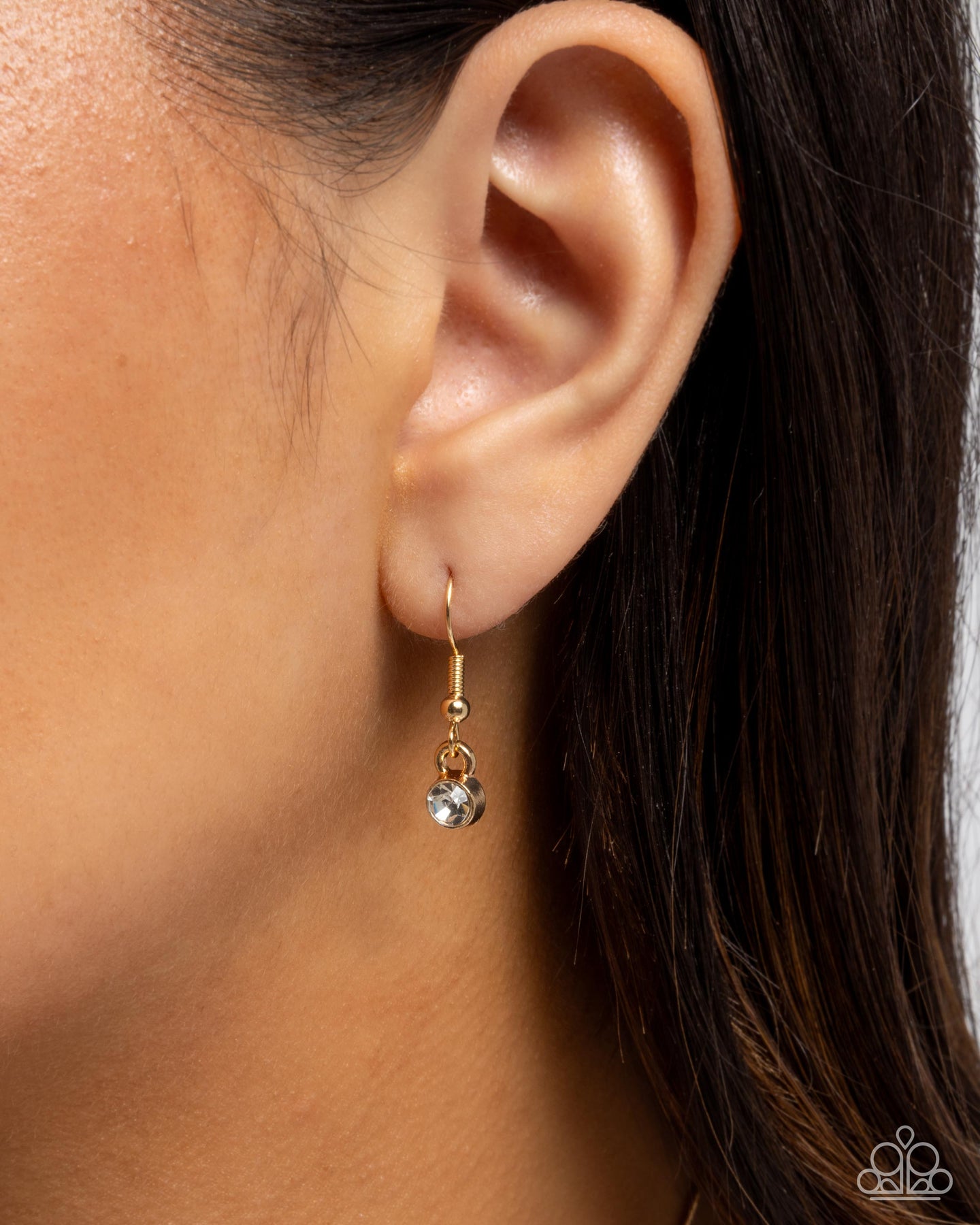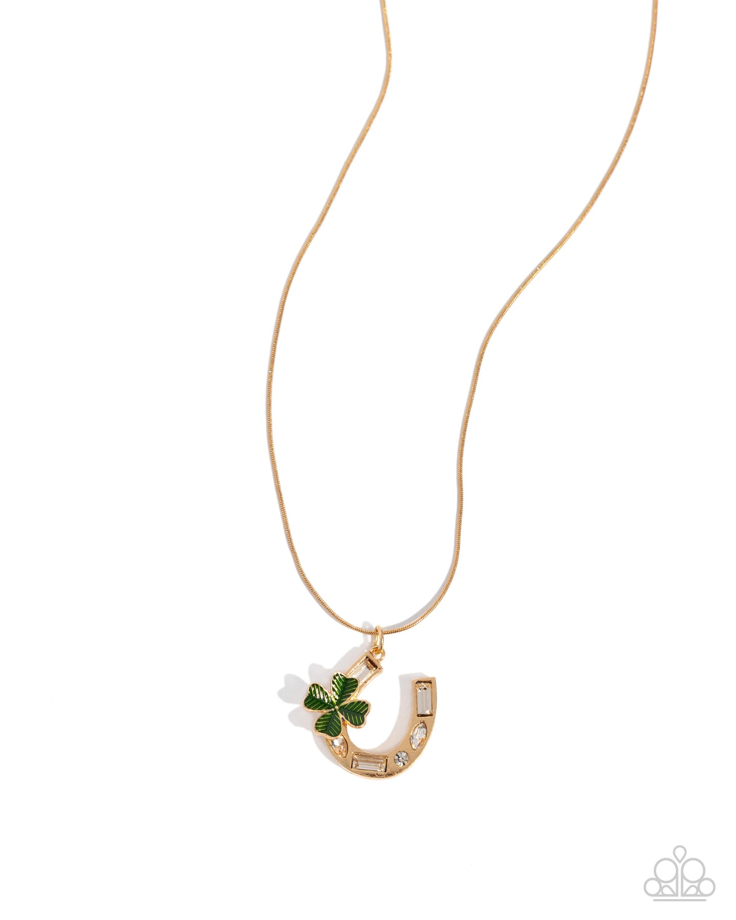 A gold horseshoe pendant adorned with white rhinestones and a green-painted clover dangles from a dainty gold chain, creating a lucky and elegant design. Features an adjustable clasp closure.