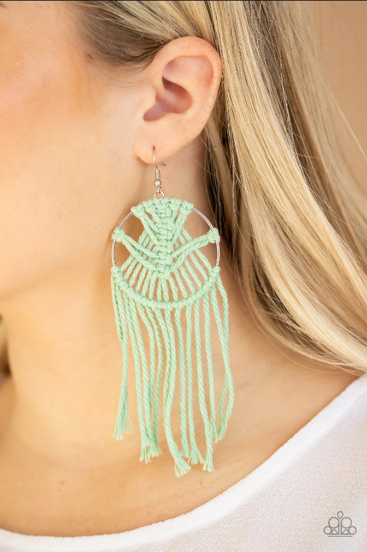 Soft Coral Pink twine is decoratively knotted around a silver hoop, creating a trendy tassel. Earring attaches to a standard fishhook fitting.