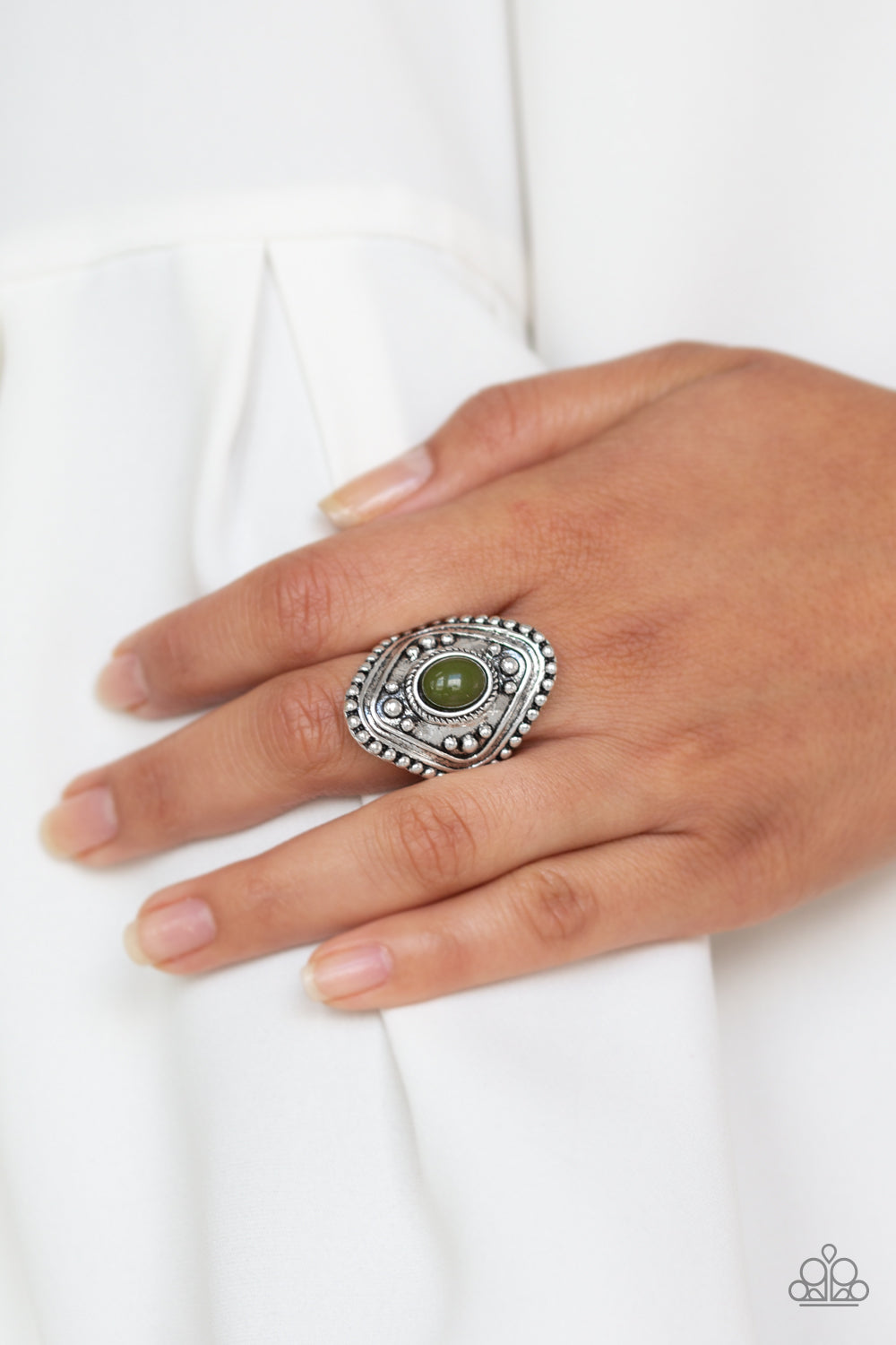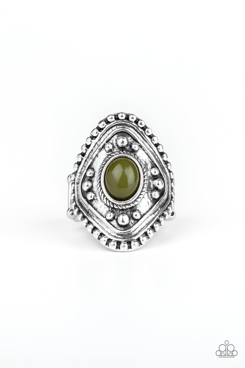 An earthy green bead is pressed into the center of a thick silver frame radiating with studded texture for a bold tribal look. Features a stretchy band for a flexible fit.