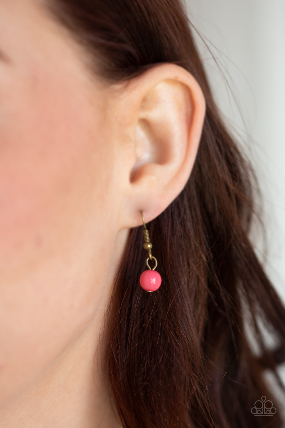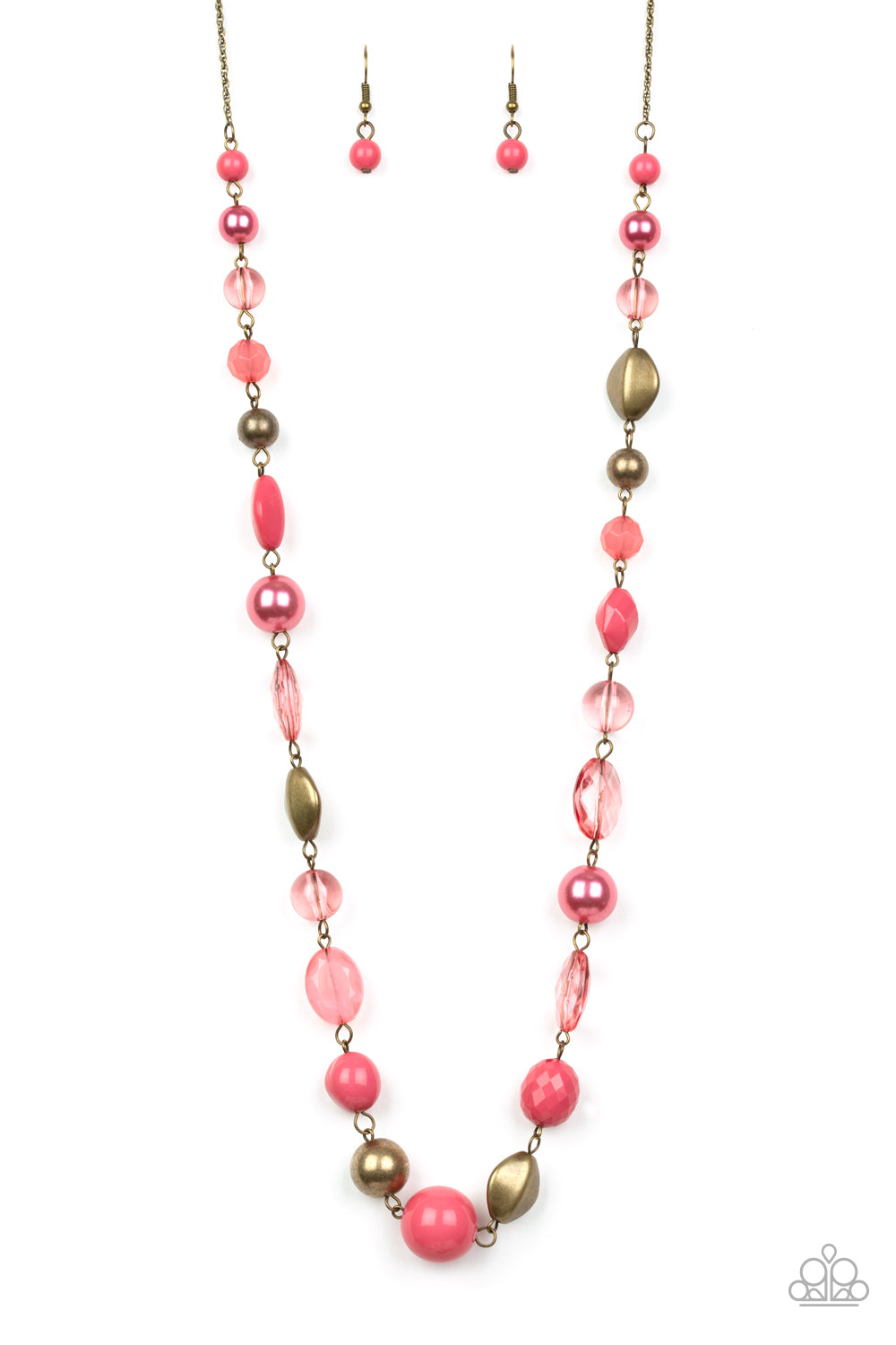 Varying in opacity and shape, a collection of polished, pearly, and glassy pink beads link with antiqued brass beads across the chest for a whimsical finish. Features an adjustable clasp closure.