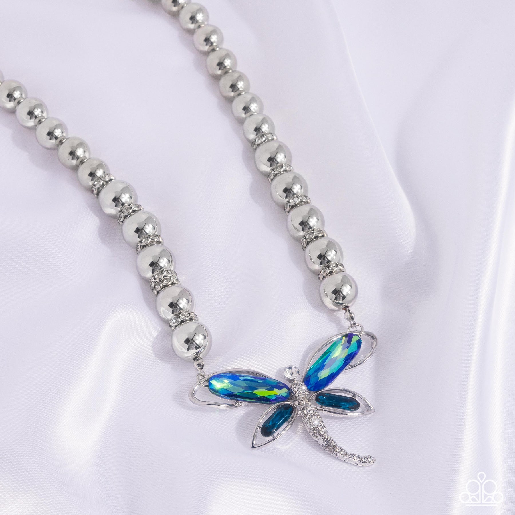 Embellished in white rhinestones, silver floral ornaments alternate with glossy silver beads on an invisible string below the neckline. A three-dimensional silver dragonfly pendant with a white gem head, a body of white rhinestones, UV-splashed blue and green upper wings, and blue oval lower wings flutters atop airy silver wings, connecting to the beaded display for a whimsically wondrous centerpiece. Features an adjustable clasp closure.