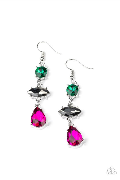A round green rhinestone, marquise-cut smoky gem, and glittery pink teardrop rhinestone dangle from ear, coalescing into an elegantly stacked lure. Earring attaches to a standard fishhook fitting.
