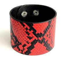 Featuring vibrant purple and white python print, a thick black leather band wraps around the wrist for a wild fashion. Features an adjustable snap closure.