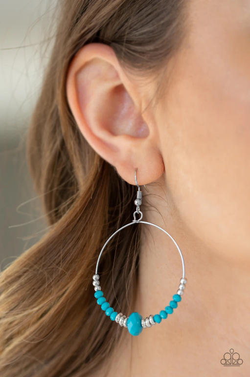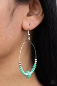 Dainty silver and refreshing green beads slide along a dainty silver hoop for a seasonal look. Earring attaches to a standard fishhook fitting.