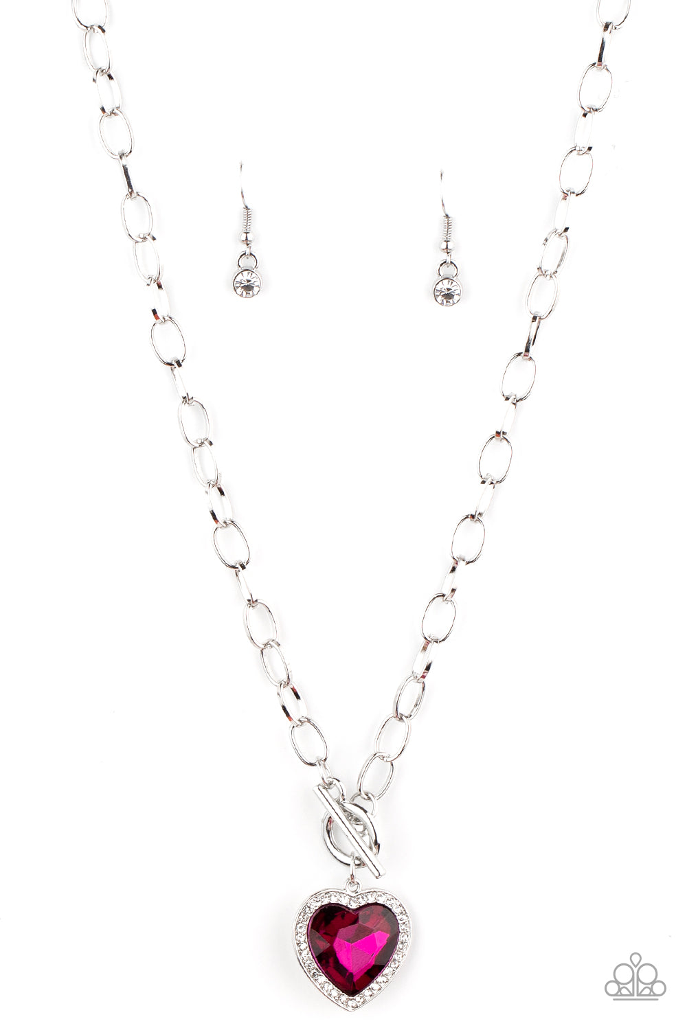 Bordered in glassy white rhinestones, a heart-shaped Pink Peacock gem is pressed into a shiny silver pendant at the bottom of a bold silver chain below the collar for a flirtatious finish. Features a toggle closure.