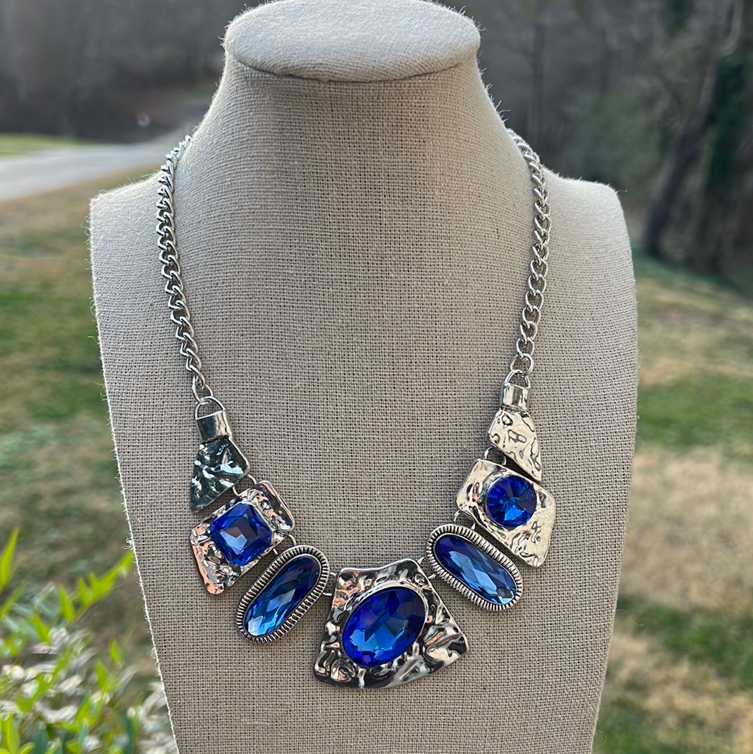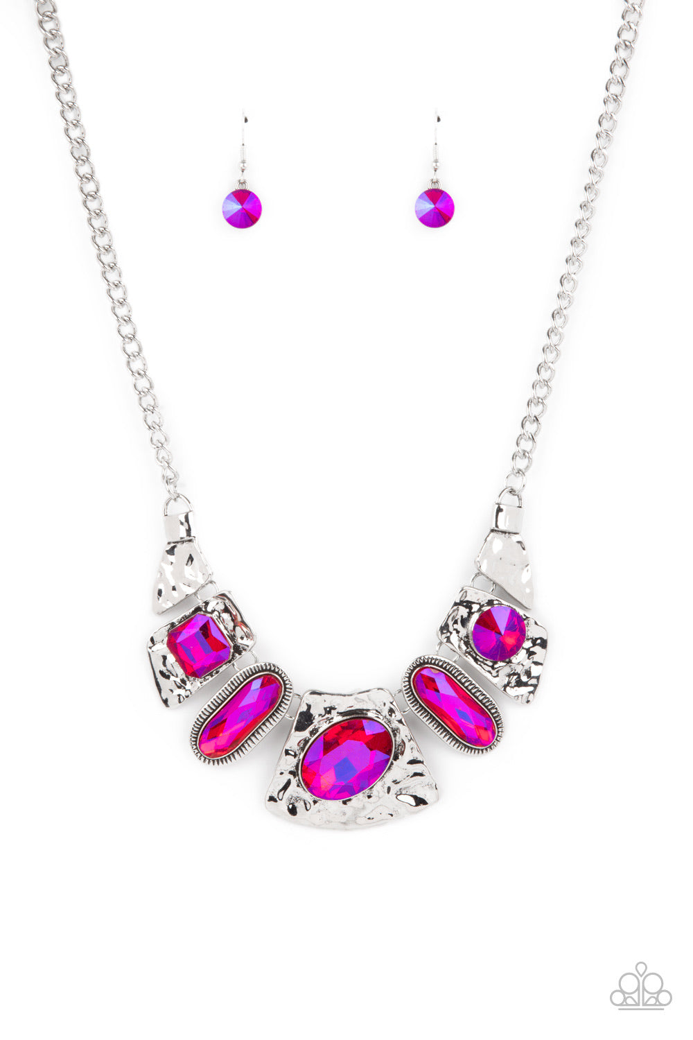 Featuring a stellar UV shimmer, mismatched iridescent multicolored gems adorn the front of hammered silver plates that abstractly connect below the collar for an out-of-this-world sparkle. Features an adjustable clasp closure.