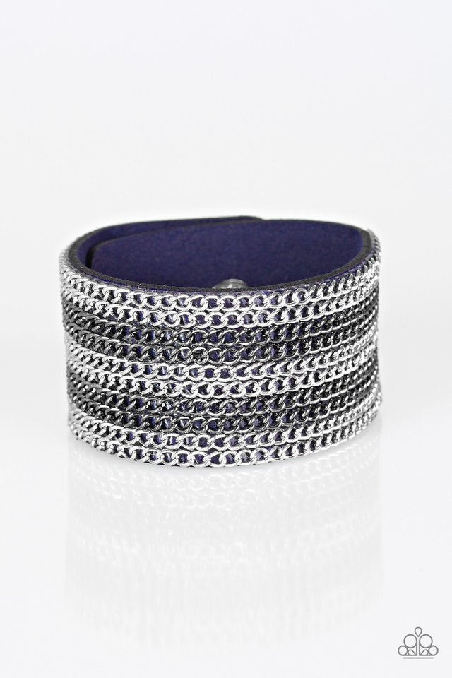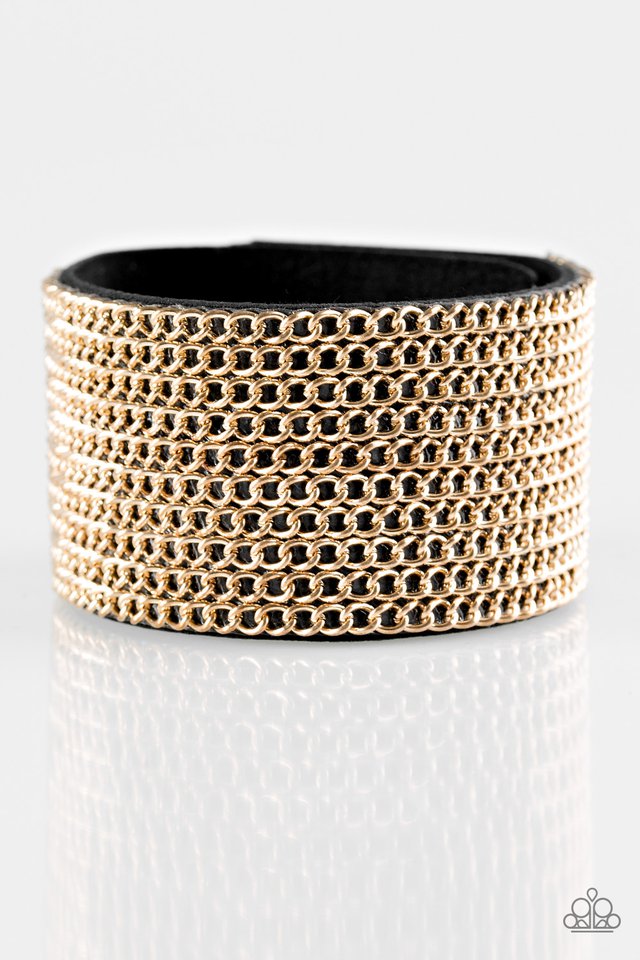 Rows of shimmery gold chains line a thick strip of black suede, creating an edgy shimmer around the wrist. Features an adjustable snap closure.