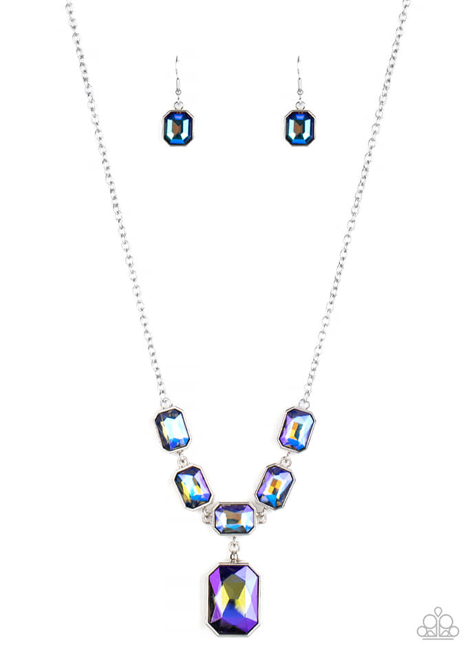 Featuring an out-of-this-world iridescence, emerald-cut iridescent gems delicately link below the collar. Attached to a dainty silver chain, the glittering row of rhinestones gives way to a dramatically oversized matching iridescent gem pendant for a statement-making finish. Features an adjustable clasp closure.