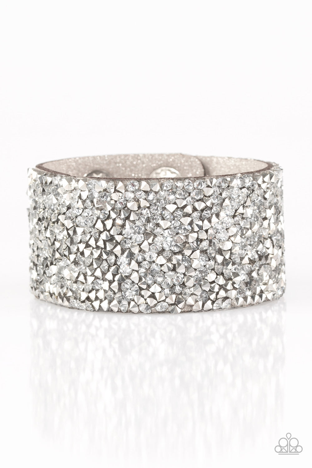 Featuring edgy prism style cuts, flashy metallic and glassy white rhinestones are sprinkled along a sparkling gray suede band, creating blinding shimmer. Features an adjustable snap closure.