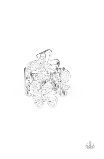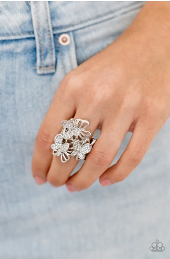 A whimsical collection of stenciled silver and clear rhinestone encrusted butterflies flutter across the finger, coalescing into a sparkling centerpiece. Features a stretchy band for a flexible fit.