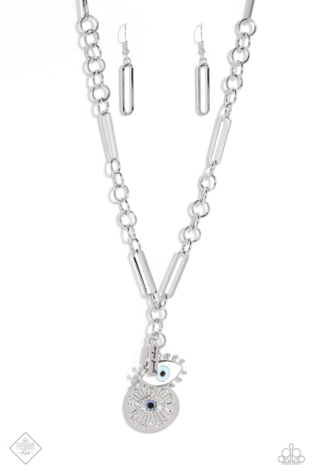 A harmonious compilation of charms, featuring tranquil shades of blue and accents of black, gather at the bottom of a handcrafted chain. Elongated paperclip links and oversized jump rings interlock as they fall down the neckline, leading to the boisterous collection of charms, which include a rectangular silver plate stamped with the phrase, "good vibes," a warped silver disc embossed in a sunburst pattern, and an eye with exaggerated eyelashes. Features an adjustable clasp closure.