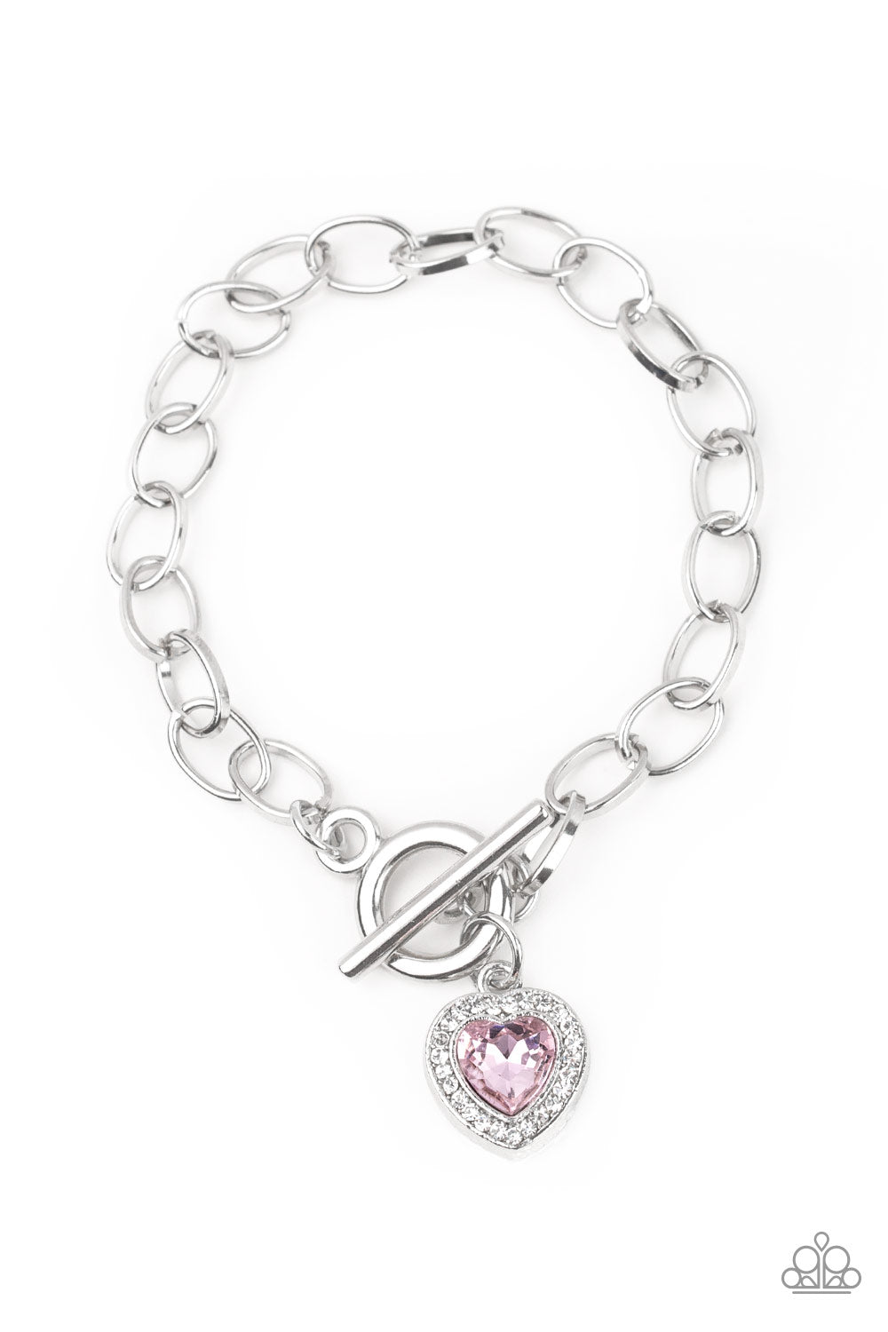 Featuring a pink heart-shaped rhinestone center, a glittery white rhinestone encrusted silver frame swings from a shimmery silver chain for a flirtatious fashion. Features a toggle closure.