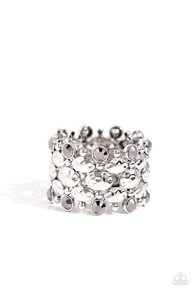 A collection of hammered oval silver beads, sleek silver beads, and faceted hematite beads are threaded along stretchy bands around the wrist, creating a zigzag pattern of edge.