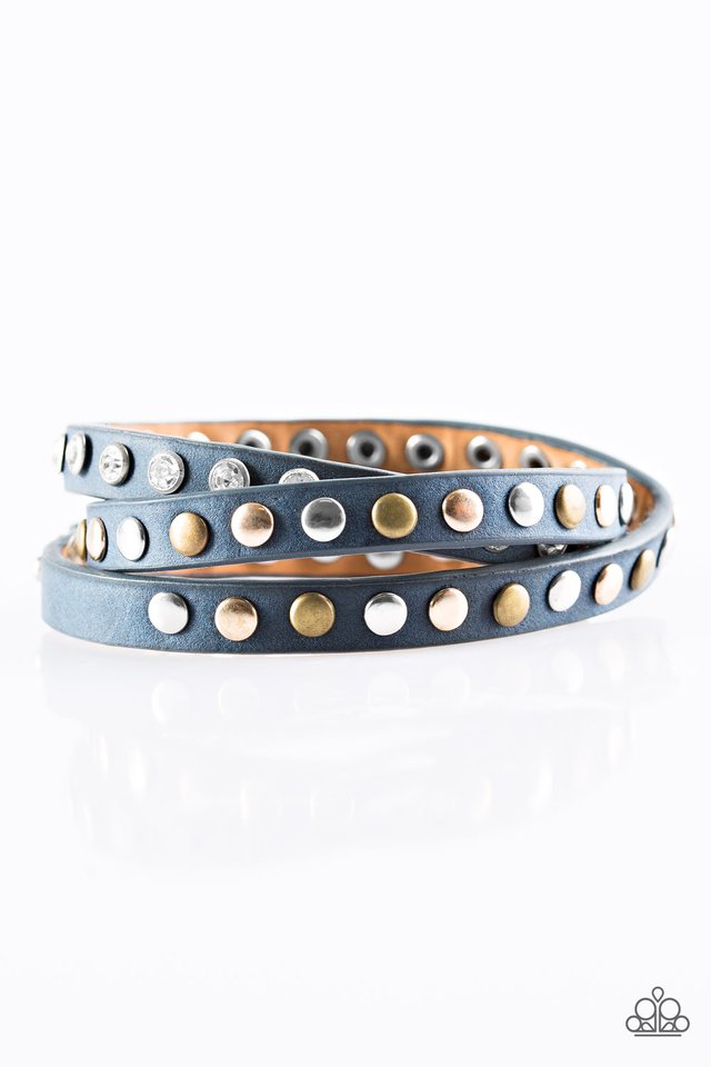 A skinny strip of blue leather is encrusted in sections of glittery white rhinestones and flat brass, rose gold, and silver studs. The elongated band double wraps around the wrist for a fierce one-of-a-kind look. Features an adjustable snap closure.