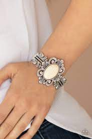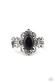 An oval turquoise bead is pressed into the center of a flowering silver centerpiece atop a cuff-like bangle. Features a hinged closure.