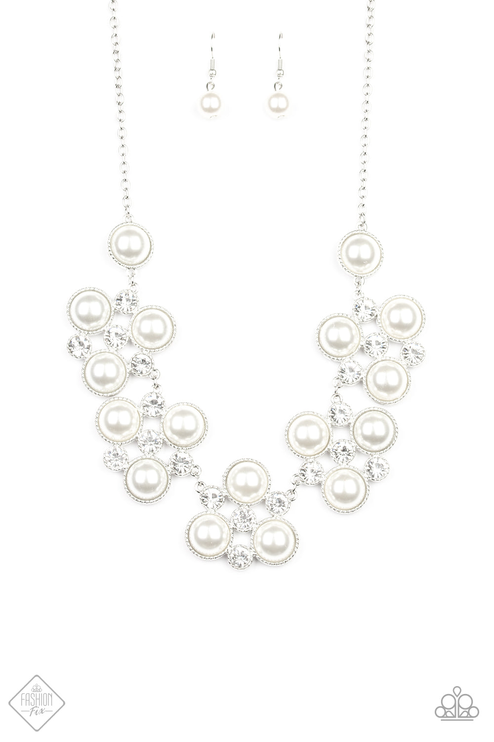 Sleek silver frames adorned in a refined mix of oversized white pearls and glassy white rhinestones, delicately link below the collar for a dramatically glamorous look. Features an adjustable clasp closure.