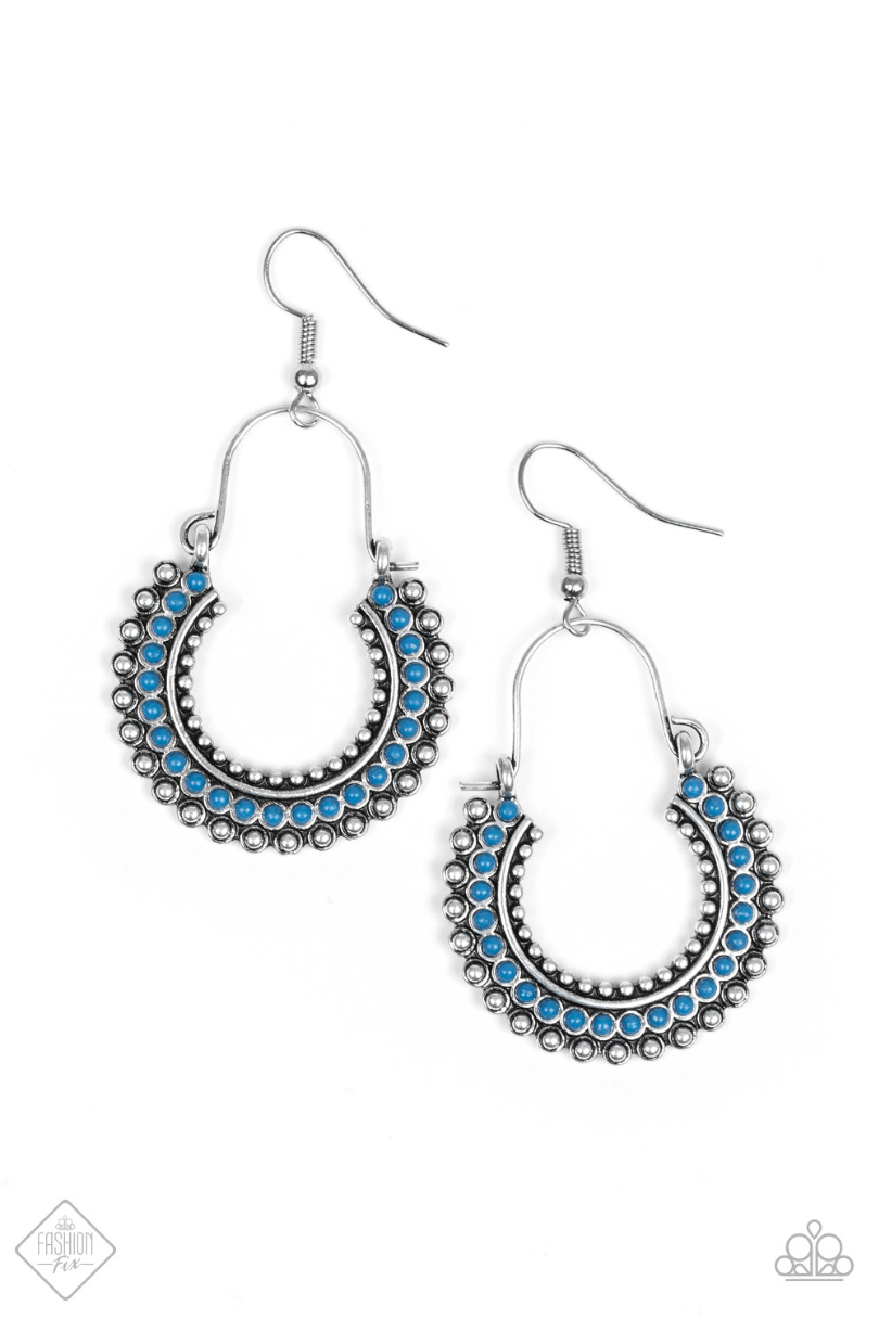 Attached to a silver wire fitting, a crescent shaped frame radiating with shimmery silver studs and refreshing blue beads swings from the ear for a seasonal look. Really Rumba Blue Earrings