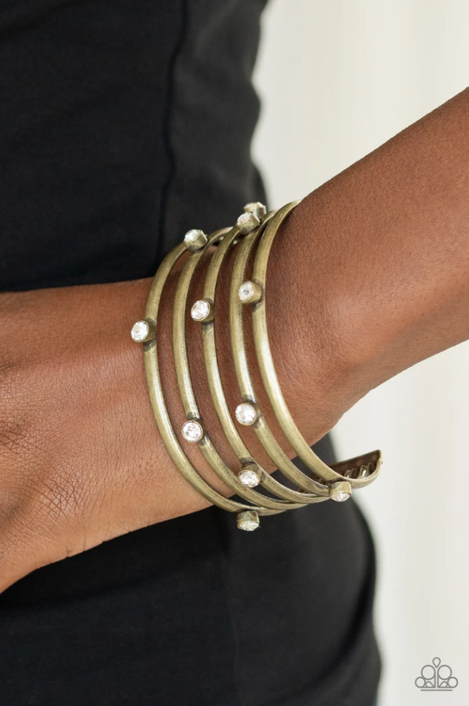 Sporadically dotted in glassy white rhinestones, thick brass bars stack across the wrist, coalescing into a statement-making cuff.