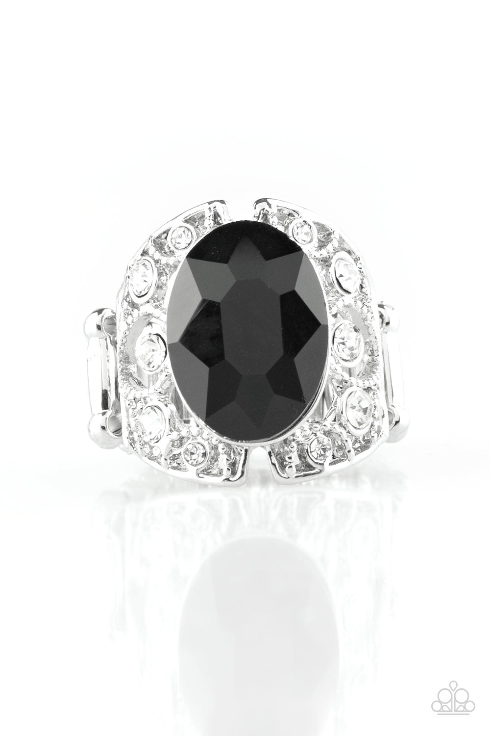 A glassy white gem sits atop a frilly filigree backdrop radiating with glassy white rhinestones for a regal look. Features a stretchy band for a flexible fit.