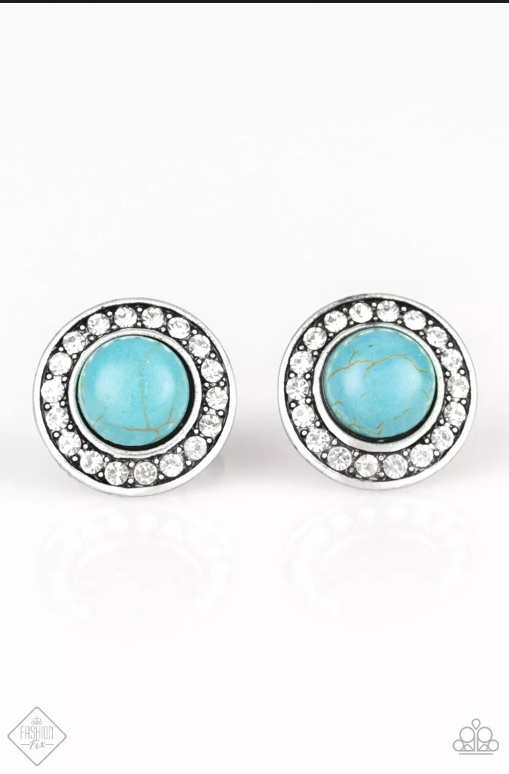 A refreshing turquoise stone is pressed into the center of a round silver frame radiating with glassy white rhinestones, creating an earthy, yet refined design. Earring attaches to a standard post fitting.