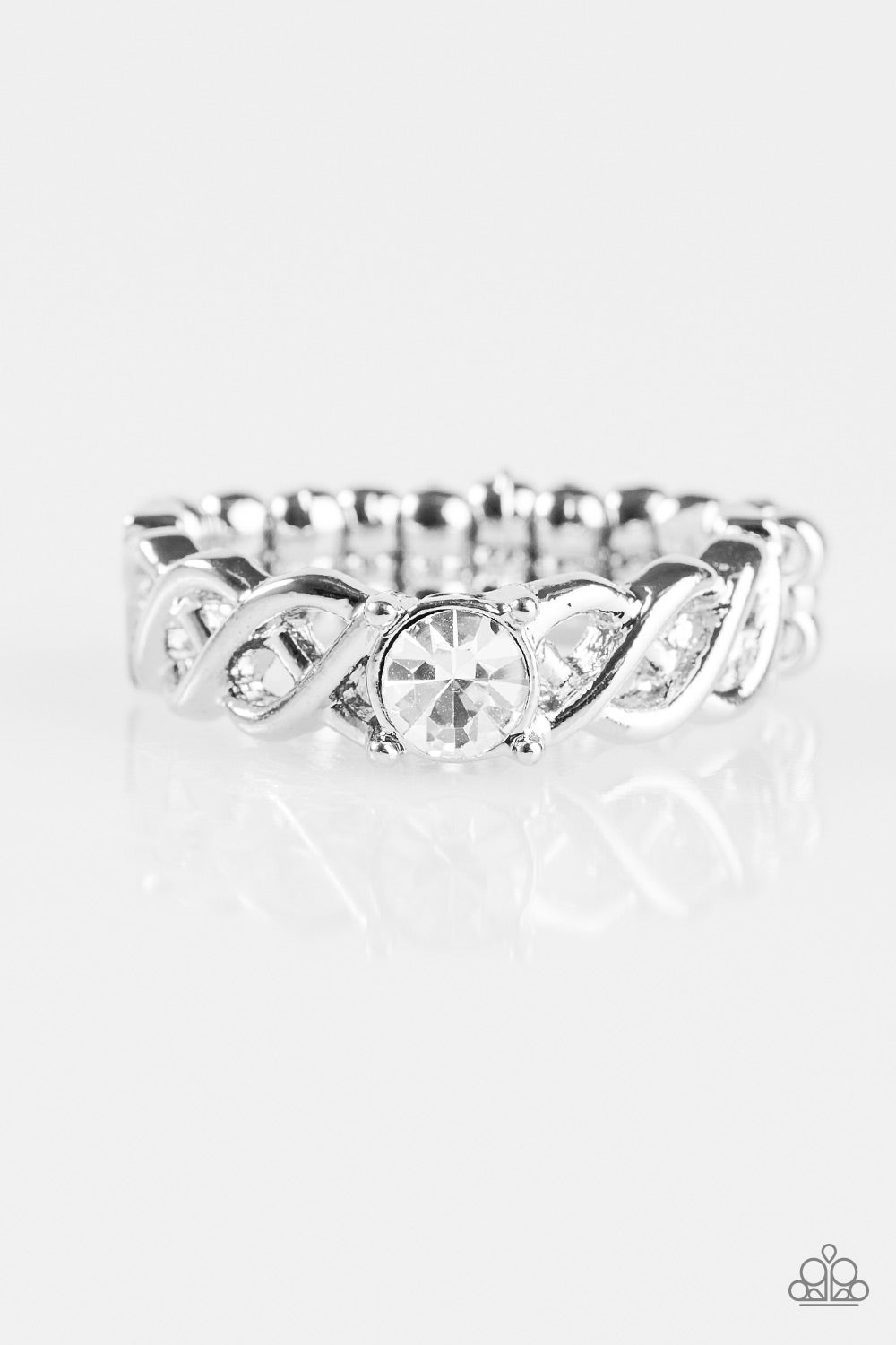 Glistening ribbons of silver crisscross across the finger, creating an airy band. A glittery white rhinestone is pressed into the center of the band, adding a radiant finish to the refined palette. Features a dainty stretchy band for a flexible fit.