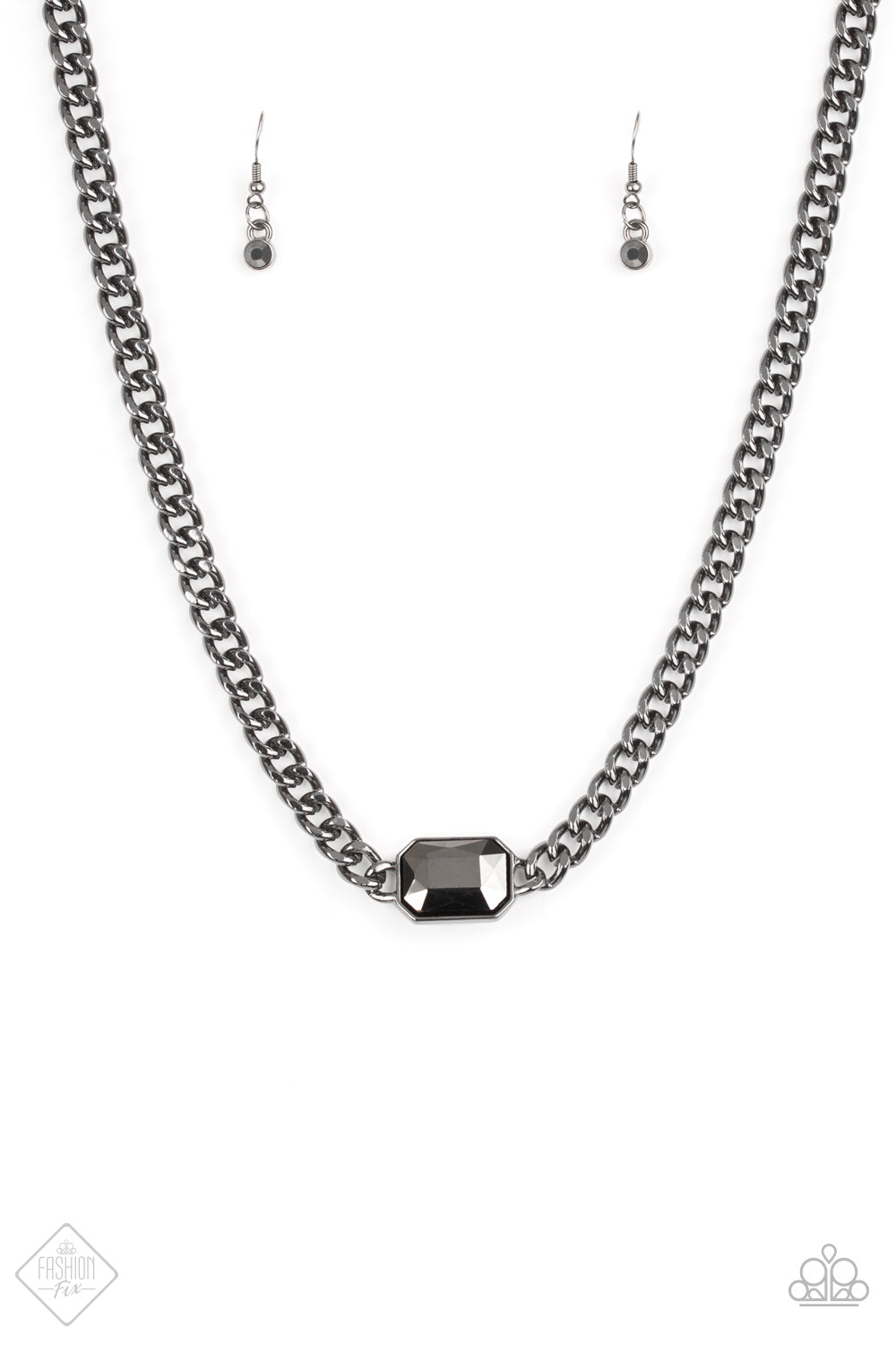 Featuring an edgy emerald-style cut, a glittery hematite gem attaches to a bold gunmetal chain, creating a dramatic stationary pendant below the collar. Features an adjustable clasp closure.