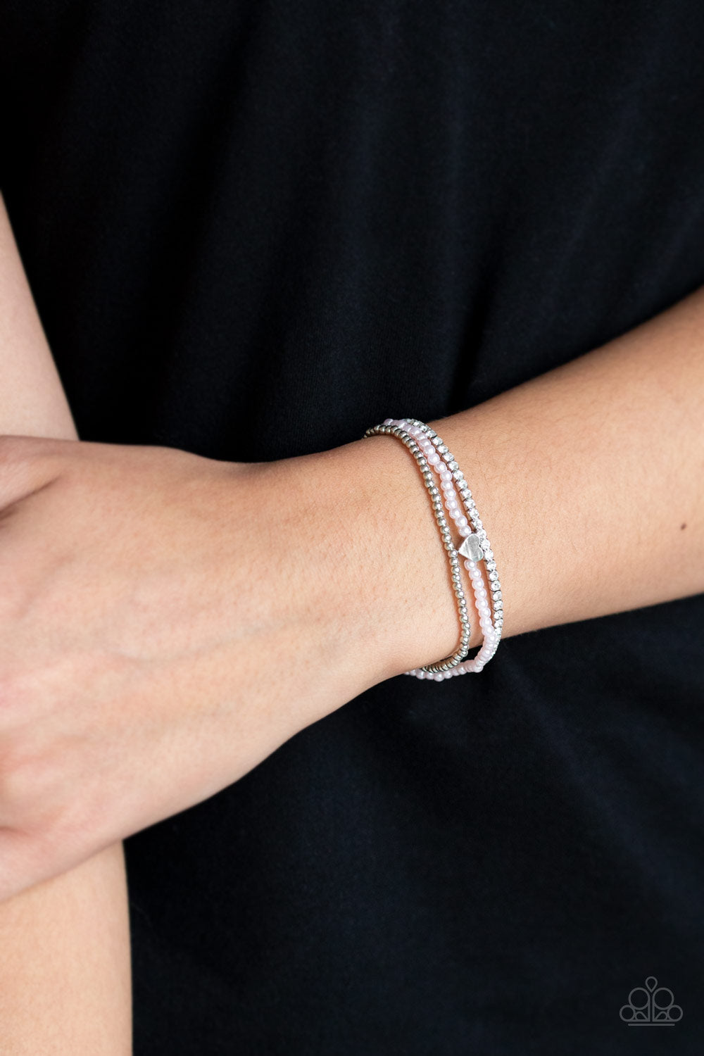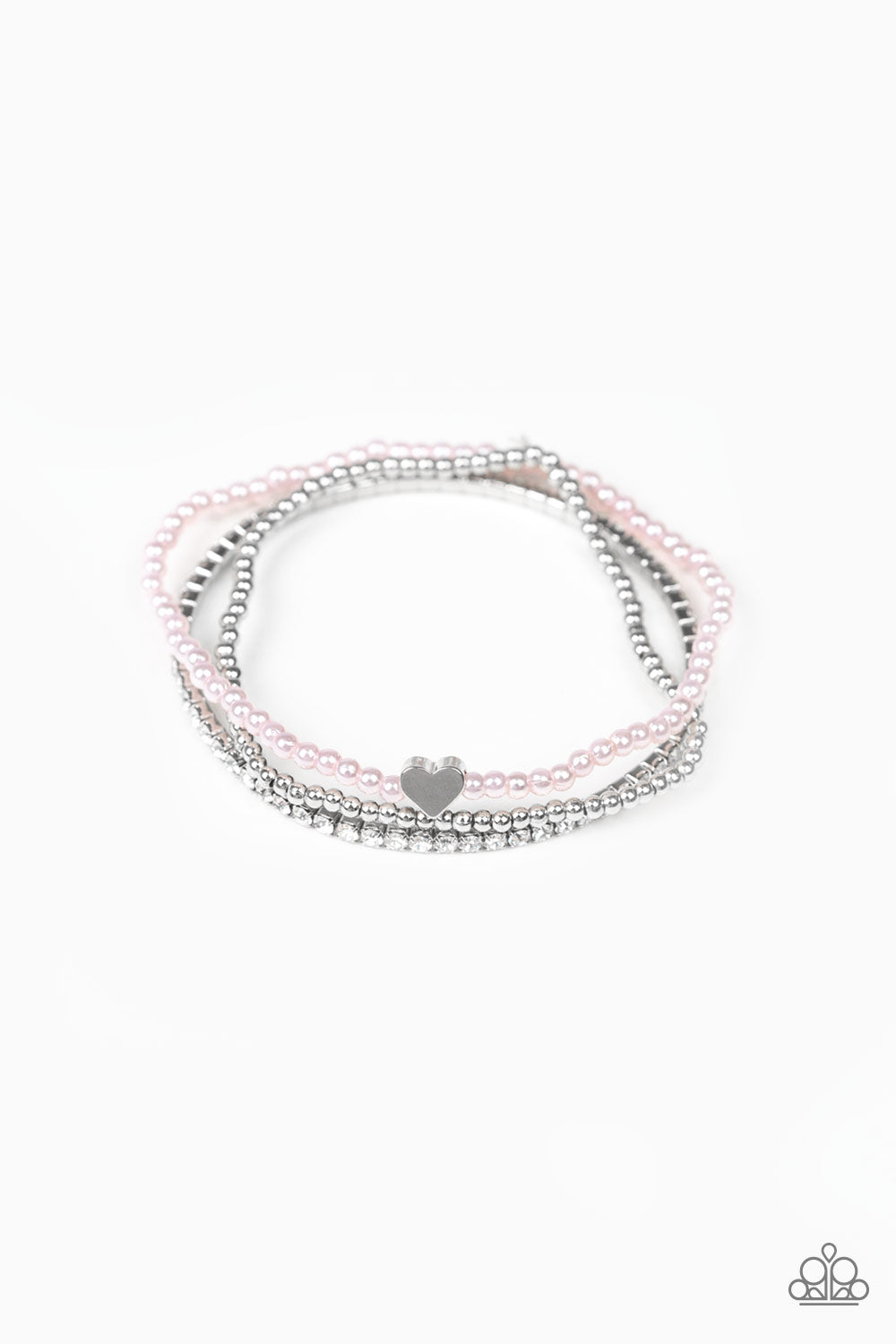 A collection of dainty silver beads, pearly pink beads, and glittery white rhinestone encrusted frames are threaded along stretchy bands around the wrist. A dainty silver heart charm is added to the pearly strand for a romantic finish.