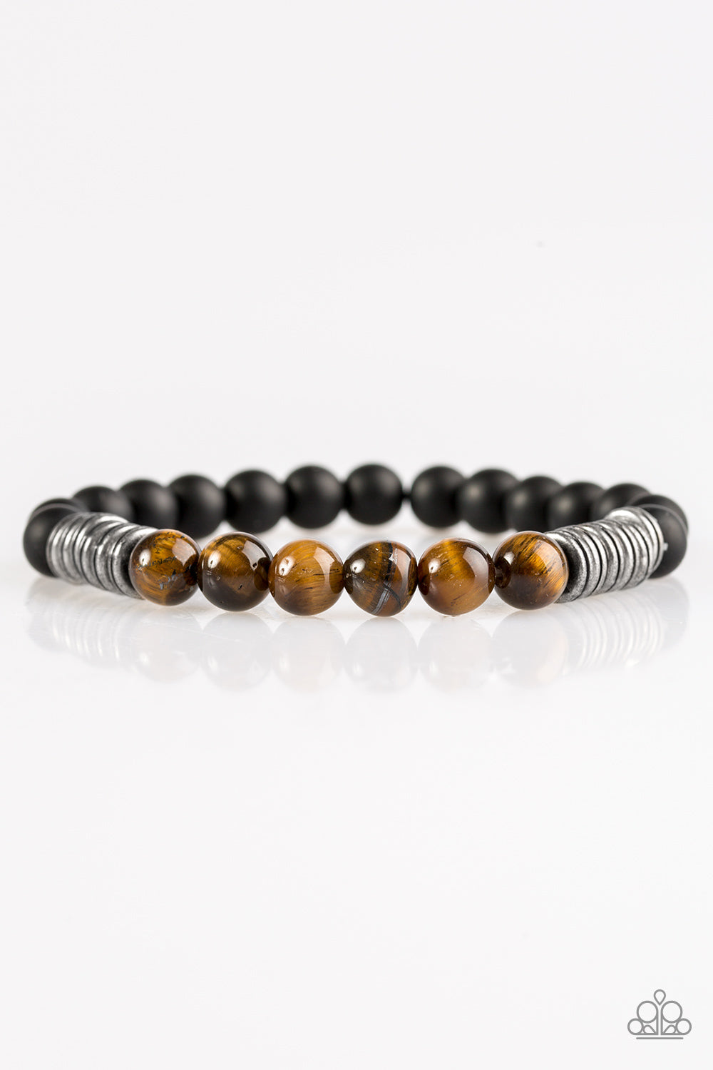 Infused with antiqued metallic accents, smooth black and energetic tiger's eye stone beads are threaded along a stretchy elastic band for a seasonal look.