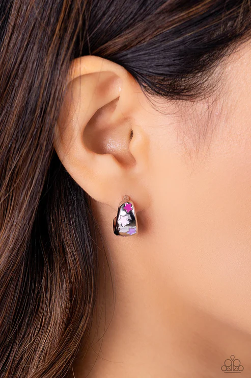 Featuring lavender, Rose Violet, and baby pink stars, a thick silver bar curves into a colorfully silver hoop resulting in a basic staple piece. Earring attaches to a standard post fitting. Hoop measures approximately 1/2" in diameter.