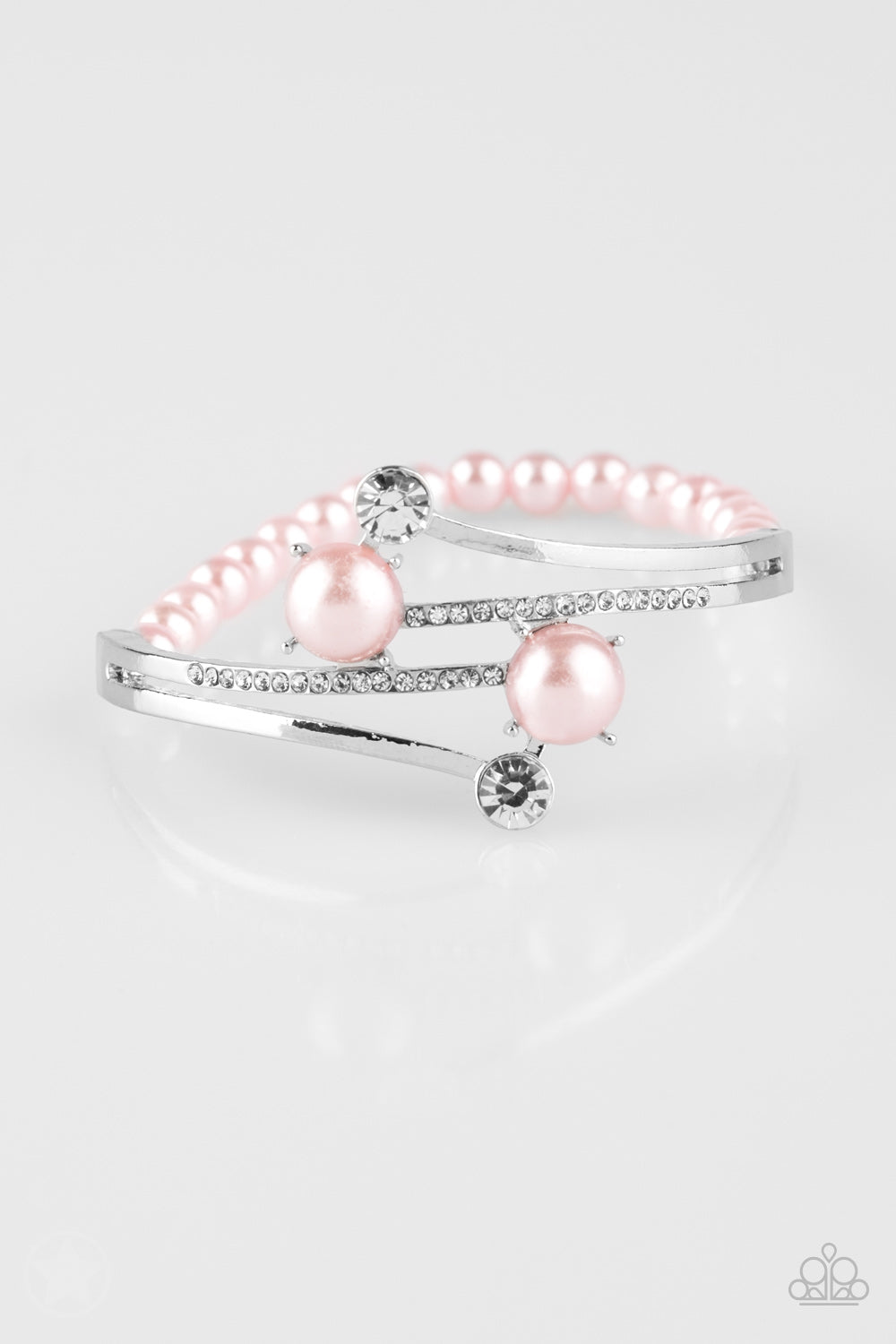 Encrusted in glittery white rhinestones, shimmery silver bars crisscross across the wrist. Dotted with pearly pink and sparkling white rhinestone fittings, the elegant centerpiece attaches to a stretchy pearl band for a refined finish.