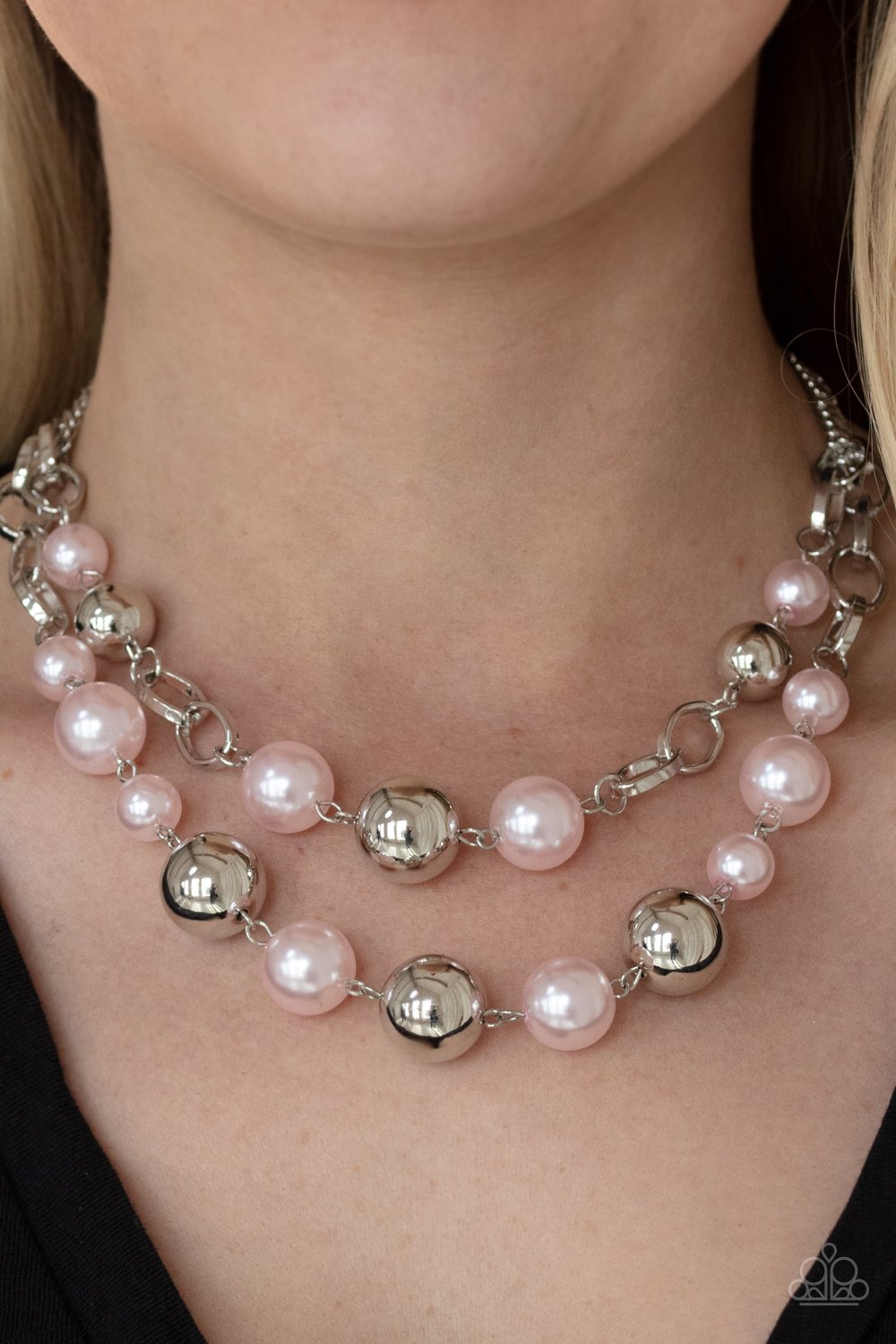 Sections of oversized silver chains, white pearls, and shiny silver beads haphazardly link into two timeless layers below the collar, creating a dramatically refined display. Features an adjustable clasp closure.
