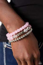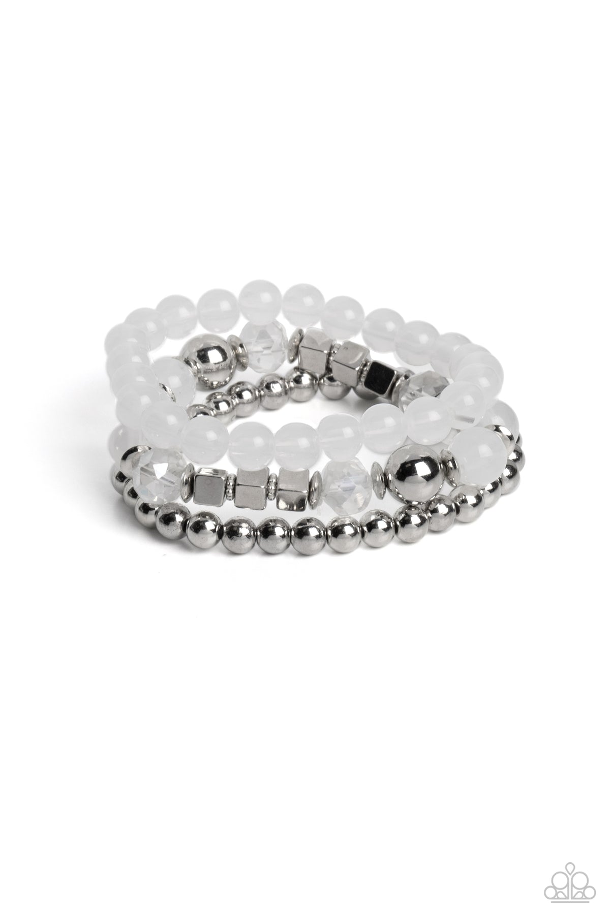 Varying in shape and size, shiny silver beads, silver cube beads, silver accents, white opaque beads, and reflective crystal-like beads are threaded along elastic stretchy bands, creating colorful layers across the wrist.