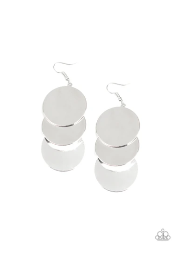 Brushed in a high sheen shimmer, delicately scratched silver discs cascade from the ear, coalescing into a blinding lure. Earring attaches to a standard fishhook fitting.