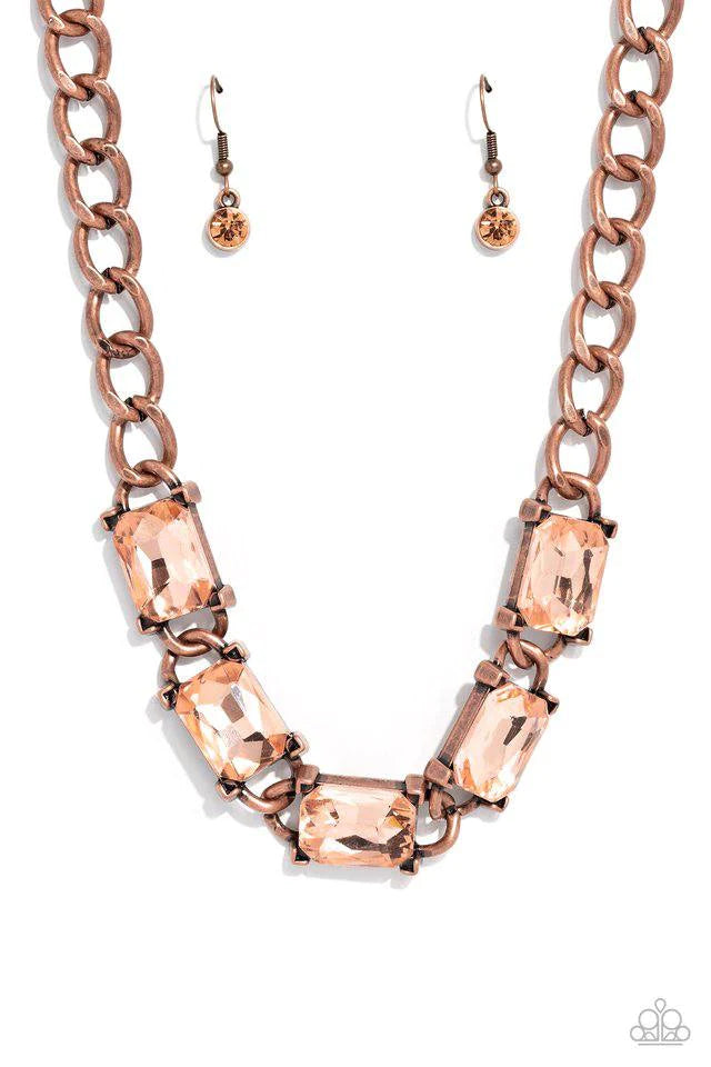 A succession of gleaming, radiant-cut, peachy gems encased in thick copper frames, coalesces around the neckline on a thick copper curb chain for an edgy statement. Features an adjustable clasp closure.