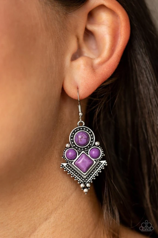 Chiseled into round and square beads, refreshing white stones are pressed into an ornate geometric frame radiating with shimmery silver studs for a tribal inspired look. Earring attaches to a standard fishhook fitting.