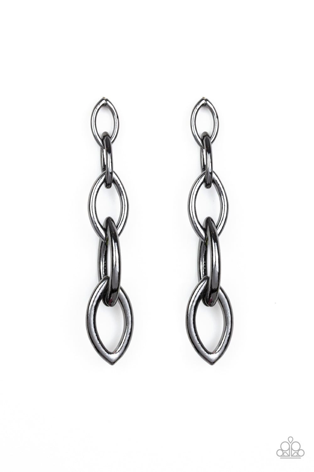 Featuring a high-sheen finish, glistening gunmetal links gradually increase in size as they trickle from the ear for an edgy look. Earring attaches to a standard post fitting.